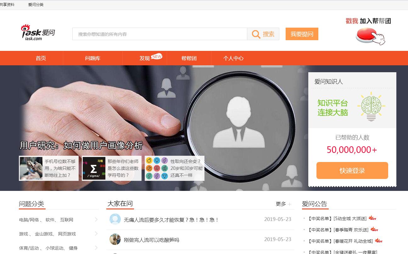 | 网站简介: 爱问研发的国内第一个中文互动型问答产品。汇聚亿万网民头脑中的智慧、经验和知识,为用户提供发表提问、解答问题、搜索答案、资料下载、词条分享等全方位知识共享服务。 |