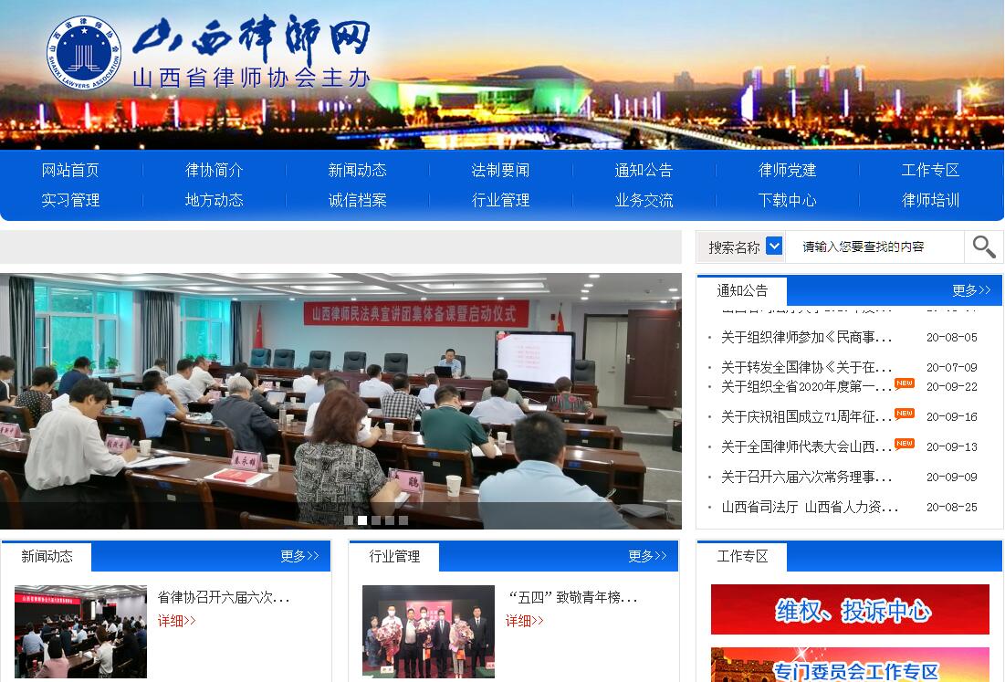山西律师网由山西省律师协会主办。山西省律师协会是依法设立的社会团体法人,是全省律师的自律性组织。山西省律师协会依法对全省律师事务所(团体会员)和执业律师(个人会员)实施行业管理。山西省律师协会接受山西省司法厅的监督和指导,同时接受中华全国律师协会的指导。山西省律师协会于1985年 成立。其宗旨是:坚持中国共产党的领导,树立社会主义法治理念,团结、带领会员忠实履行中国特色社会主义法律工作者的职责使命,维护当事人的合法权益,维 护法律的正确实施,维护社会公平正义,完善律师执业权利保障机制,恪守律师职业道德和执业纪律,推动法治进程,促进社会和谐发展和文明进步。其职责是: (一)制定行业发展规划;(二)制定并组织实施律师执业规范和行业管理制度;(三)支持会员依法业,维护会员合法权益,完善会员执业权利保障机制;(四) 开展律师职业道德和执业纪律教育;(五)组织律师执业前培训和执业后继续教育;(六)总结、交流律师工作经验,组织行业发展战略和专业理论研究;(七)对 会员进行登记、管理和考核;(八)对申请律师执业实习人员进行管理和考核;(九)开展律师工作宣传和对外交流;(十)受理对会员的投诉或举报,受理会员的 申诉,调处会员执业活动中发生的纠纷;(十一)制定会员奖励与惩戒办法,实施对会员的奖励与惩戒;(十二)协调与立法、司法、行政机关及其他组织的关系, 提出立法、司法或相关建议;(十三)参与立法活动,开展法制宣传,提出法治建设及律师制度建设的意见和建议;(十四)创办会员福利事业,组织会员同业互 助;(十五)组织开展法律援助,参加社会公益活动;(十六)负责会费的收缴、管理和使用;(十七)办理中华全国律师协会、同级司法行政部门委托的事项;(十八)法律、法规、规章规定的其他职责。