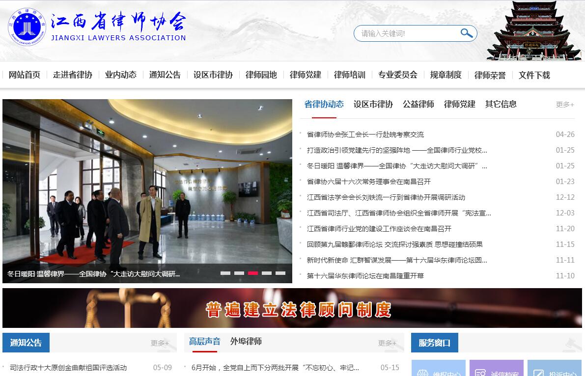 江西省律师协会(以下简称本会)成立于1981年,是依法设立的、由江西省全体律师及律师事务所组成的社会团体法人,是律师的行业自律性组织,依法对律师行业提供服务和实施管理。本会宗旨:团结带领会员忠实履行中国特色社会主义法律工作者职责,维护法律的正确实施、维护社会公平和正义、维护当事人的合法权益,维护会员的合法权益和行业的整体利益,反映会员诉求,为会员的执业提供服务,管理、教育、监督会员,规范会员执业行为,提高会员的职业操守和执业能力,发展律师事业,为建设社会主义法治国家,促进社会和谐发展和文明进步而奋斗。本会的宗旨是:拥护和坚持中国共产党的领导,团结带领会员维护当事人合法权益,维护法律正确实施,维护社会公平和正义, 做中国特色社会主义法律工作者,为推进本省社会经济发展,建设法治江西、平安江西、和谐江西发挥积极作用,为建设中国特色的社会主义法治国家,促进社会和谐发展和文明进步而奋斗。本会在江西省司法厅的监督、指导下,依法自主开展工作,并接受中华全国律师协会的指导。本会最高权力机构是律师代表大会,理事会是代表大会的常设机构,常务理事会在理事会闭会期间行使理事会职权。秘书处为本会的日常办事机构,由秘书长、副秘书长及办公室、会员部、业务部、宣传部、奖惩维权部(两个中心)、培训考核部、律师行业党建办公室、江西律师网和《江西律师》编辑部组成。为充分发挥行业自律职能,本会设有执业权益保障、纪律(奖惩)、发展与规范、教育培训、宣传联络、律师事务所管理、资产管理与财务、法律公益与社会责任、青年律师工作、女律师工作、公司与公职律师、文体、厅直工委等十三个专门工作委员会,负责履行本会各项专门职责。本会同时还成立了刑事、民商事、行政、法律顾问、公司、知识产权、建设工程、房地产、婚姻与家庭、金融与保险、互联网、企业破产管理、劳动与社会保障、证券与资本市场等十五个专业委员会,负责开展业务研讨和交流,指导本省律师开展各类相关法律服务。