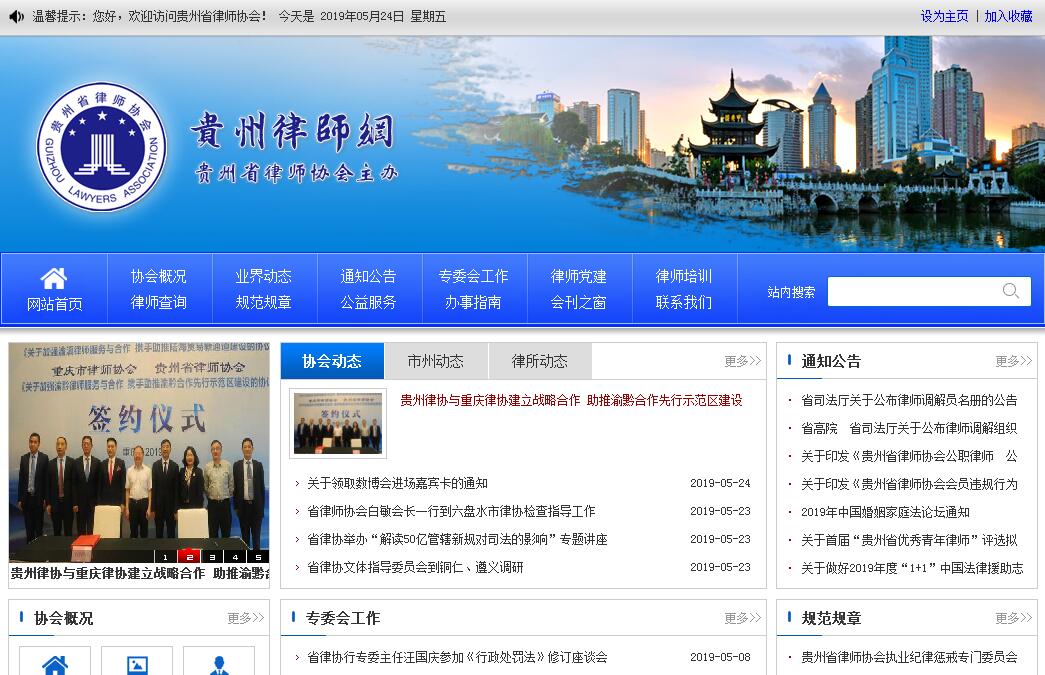 贵州省律师协会成立于1986年,是由本省全体律师执业机构和执业律师组成的社会团体法人,是本省全体律师执业机构和执业律师的自律性组织,依法对本省全体律师执业机构和执业律师实施行业管理并提供服务。贵州省律师协会接受行政主管机关贵州省司法厅和登记管理机关贵州省民政厅的的监督、指导,接受中华全国律师协会的指导。贵州省律师协会下辖有贵阳市律师协会、遵义市律师协会、六盘水市律师协会、安顺市律师协会、毕节市律师协会、铜仁市律师协会、黔东南州律师协会、黔南州律师协会、黔西南州律师协会。贵州省律师协会的宗旨是:坚持中国共产党的领导,团结带领会员高举中国特色社会主义伟大旗帜,忠实履行中国特色社会主义法律工作者的职责使命,维护当事人合法权益、维护法律的正确实施,维护社会公平和正义,为建设社会主义法治国家,促进社会和谐发展和文明进步而奋斗。贵州省律师协会的最高权利机构为全省律师代表大会。贵州省律师协会每四年举行一次全省律师代表大会,选举产生理事会,理事会选举产生会长、副会长和常务理事。在全省律师代表大会和理事会闭会期间,常务理事会行使理事会的职权,执行全省律师代表大会的决议。依据《中华人民共和国律师法》和《贵州省律师协会章程》,贵州省律师协会的主要职责有:(一)制定本省律师行业发展规划;(二)监督实施律师行业管理制度和执业规范,指导并督促律师执业执业机构规范化建设;(三)负责律师职业道德和执业纪律教育、检查和监督;(四)支持会员依法执业,维护会员合法权益;(五)鼓励和支持律师参政议政;(六)宣传律师工作,提升律师社会形象;(七)组织实施律师执业继续教育,总结交流工作经验,提高会员执业水平;(八)组织实施律师执业宣誓活动;(九)负责个人会员考核管理,协助和配合司法行政机关对团体会员进行考核管理;(十)为会员提供福利和其他救助;(十一)组织会员开展社会公益活动;(十二)制定并实施会员奖励与惩戒办法;(十三)处理对会员的投诉;(十四)调处会员在执业活动中发生的纠纷;(十五)对会员违法违纪行为进行调查取证,作出行业处分,并向司法行政机关提出行政处罚建议;(十六)组织管理申请律师执业人员的实习活动和考核;(十七)协调与相关国家机关的关系,提出立法和司法建议;(十八)指导市、州律师协会工作;(十九)司法行政机关及全国律协确定或委托的其他职责;(二十)法律、法规、规章规定的其他职责。