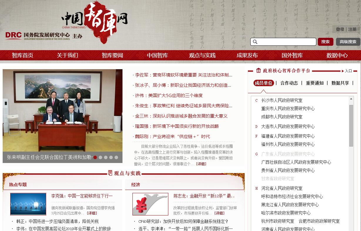 中国智库网由国务院发展研究中心主办,全国政策咨询信息交流协作机制成员单位共同建设,国务院发展研究中心信息中心承办。国务院发展研究中心是直属中国国务院的政策研究和咨询机构。主要职能是研究中国国民经济、社会发展和改革开放中的全局性、战略性、前瞻性、长期性以及热点、难点问题,开展对重大政策的独立评估和客观解读,为党中央、国务院提供政策建议和咨询意见。2013年9月,国务院发展研究中心和部分省区市、计划单列市和省会城市发展研究中心(研究室)共同发起成立全国政策咨询信息交流协作机制,并建立 “联席会议”制度,旨在促进全国政策咨询信息交流与协作。“联席会议”成员单位由国务院发展研究中心信息中心、各省区市、计划单列市以及省会城市政府发展研究中心(研究室)组成,国务院发展研究中心信息中心为牵头单位。“联席会议”实行领导小组负责制,领导小组组长由国务院发展研究中心分管信息工作的领导担任,副组长由国务院发展研究中心信息中心主任、各省区市政府发展研究中心(研究室)负责同志轮流担任。2014年9月,国务院发展研究中心主任办公会决定建设中国智库网,共建单位为全国政策咨询信息交流协作机制成员单位,以及上海社会科学院、深圳综合开发研究院等。参加全国政策咨询信息交流协作机制的省级政府发展研究中心(研究室)有29家(按单位名称拼音字母排序):安徽省政府发展研究中心、重庆市政府发展研究中心、福建省政府发展研究中心、广东省政府发展研究中心、广西壮族自治区政府发展研究中心、贵州省政府发展研究中心、甘肃省政府研究室、河北省政府研究室、黑龙江省政府发展研究中心、河南省政府发展研究中心、湖北省政府研究室、湖南省政府发展研究中心、海南省政府研究室、吉林省政府发展研究中心、江苏省政府研究室、江西省政府发展研究中心、辽宁省政府发展研究中心、内蒙古发展研究中心(经济信息中心)、宁夏自治区政府研究室(发展研究中心)、青海省政府发展研究中心、山西省政府发展研究中心、上海市政府发展研究中心、山东省政府研究室、四川省政府研究室、陕西省政府研究室(发展研究中心)、西藏自治区政府研究室、新疆维吾尔自治区政府发展研究中心、云南省政府发展研究中心、浙江省政府发展研究中心;参加全国政策咨询信息交流协作机制的计划单列市发展研究中心(研究室)有5家(按单位名称拼音字母排序):大连市政府发展研究中心、宁波市政府发展研究中心、青岛市政府研究室、深圳市政府发展研究中心、厦门市发展研究中心;参加全国政策咨询信息交流协作机制的省会城市发展研究中心(研究室)有22家(按单位名称拼音字母排序):长沙市政府研究室、成都市政府研究室、福州市政府发展研究中心、呼和浩特市经济社会发展研究中心、哈尔滨市政府发展研究中心、杭州市政府研究室、合肥市政府政策研究室、济南市政府研究室、昆明市政府研究室、兰州市政府研究室、南昌市政府经济社会发展研究室、石家庄市政府研究室、沈阳市政府研究室、太原市政府发展研究中心、武汉市政府决策咨询委员会、西安市政府研究室、西宁市政府经济和社会发展研究室、乌鲁木齐市政府研究室、银川市政府研究室、长春市委市政府政策研究室、郑州市政府研究室、广州市委政策研究室。中国智库网由国务院发展研究中心信息中心承办。作为国务院发展研究中心直属事业单位,信息中心主要负责国务院发展研究中心的信息化建设组织与管理、政策研究数据信息服务与保障、中心品牌塑造与成果宣介等工作。中国智库网的宗旨是:“荟萃智库思想、推动智库合作、提升智库成就”。中国智库网致力于搭建以政府系统智库为主体的信息交流与合作平台,促进国务院发展研究中心与各类智库的沟通联系,促进智库之间的交流合作,服务中国特色新型智库建设。中国智库网秉承国务院发展发展研究中心“开门办智库”的理念,欢迎各类智库及相关机构加入中国智库网,携手合作,共同努力,促进中国智库不断取得新成就。