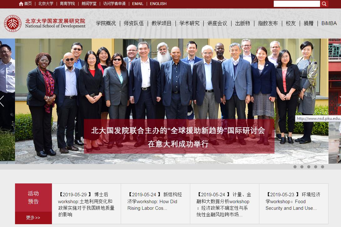 北京大学国家发展研究院(NSD)是北京大学的一个以经济学为基础的多学科综合性学院,前身是林毅夫等六位海归经济学博士于1994年创立的北京大学中国经济研究中心(CCER),随着更多学者的加入以及科研和教学等方面的拓展, 2008年改名为国家发展研究院(简称国发院)。国发院拥有众多国内知名学者,除林毅夫、海闻、易纲、张维迎等创始人之外,还包括周其仁、宋国青、曾毅、闵维方、姚洋、黄益平、卢锋、刘国恩、张晓波、李玲、赵耀辉、傅军和陈春花等著名经济学、管理学、政治学、教育经济学和人口学方面的知名学者。学院秉承北大兼容并包、和而不同的学风,高度关注中国的现实问题,致力于学术与现实的结合,不遗余力地推动中国进步。经过二十多年的发展,国发院已经形成了集教学、科研和智库于一身的综合性学院,成为北大构建世界一流大学的重要组成部分。 在教学方面,国发院已经形成政、商、学三大教学体系。在学术教育方面,国发院的经济学硕士和博士项目在全国处于领先地位,毕业生已经成为中国经济学界的生力军;经济学双学位项目经过二十多年的锤炼,已经成为北大的一张重要名片。从2017年秋季起,国发院将招收国家发展方向的本科生,培养以经济学为基础,并通晓哲学、历史和政治学等人文社会科学基本原理的综合性人才。在商学教育方面,国发院旗下的BiMBA项目始于1998年,MBA和EMBA教育以学术导向和严谨的教学彰显于世,学员评价长期处于国内领先地位;EDP项目以高端定制企业内部培训为主,广受社会的好评。在政府行政和经济管理教育方面,国发院承办商务部援外项目,创立北京大学南南合作与发展学院,专门培养发展中国家的中高级官员。 在科研方面,国发院在国内外的人均学术发表处于国内领先行列,教师的学术论文发表于《美国经济评论》(American Economic Review)、《政治经济学杂志》(Journal of Political Economy)、《经济学期刊》(Economic Journal)、《中国社会科学》、《经济研究》、《经济学季刊》等国内外著名学术杂志上,并产生了一些有影响力的研究成果。中国经济研究中心为中国经济学界提供一个重要的学术交流平台。在智库建设方面,国发院秉承“小机构、大网络”的理念,聚合北大乃至全球的研究资源,在政府与市场的关系、新农村建设、土地问题、国企改革、电信改革、股市治理、人口政策以及经济结构调整等诸多重大问题上,产生了一批有影响力的政策建议,并被政府所采纳。经过多年的耕耘,国发院已经成为中国高校智库当中当之无愧的领军者,2016年入选国家首批高端智库。国发院拥有“中国经济观察报告会”、“格政”和“国家发展论坛”三个智库品牌活动,并牵头组织“中美经济对话”和“中美卫生对话”,在中美民间外交方面做出了突出的贡献。