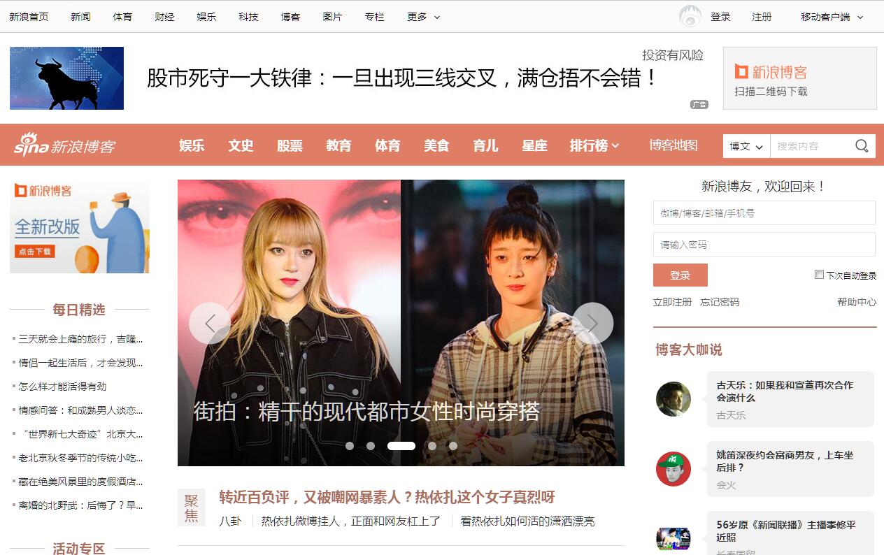 | 网站简介: 新浪网博客频道是全中国最主流,最具人气的博客频道。拥有最耀眼的娱乐明星博客、最知性的名人博客、最动人的情感博客,最自我的草根博客。 |
