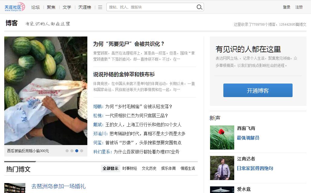 | 网站简介: 天涯博客是天涯社区开办的独立博客平台,这里可以表达网民立场,聚集意见领袖,众多草根精英以他们的观点影响社会的进程。天涯博客,有见识的人都在此! |