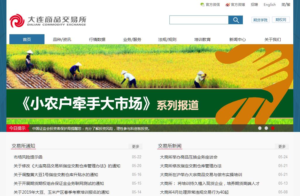大连商品交易所成立于1993年2月28日,并于同年11月18日开始营业,是中国四家期货交易所之一,也是中国东北地区唯一一家期货交易所。目前已上市玉米、玉米淀粉、黄大豆1号、黄大豆2号、豆粕、豆油、棕榈油、鸡蛋、纤维板、胶合板、线型低密度聚乙烯、聚氯乙烯、聚丙烯、乙二醇、焦炭、焦煤、铁矿石共计17个期货品种和豆粕、玉米两个期权品种,并推出了棕榈油、豆粕、玉米、焦炭、焦煤和铁矿石等14个期货品种和2个期权品种的夜盘交易。2018年5月,铁矿石期货引入境外交易者业务正式实施;2018年12月,商品互换业务正式上线,大商所建立了多元开放衍生品市场新格局,在多元开放战略转型和全面建设国际一流衍生品交易所道路上迈出了坚实步伐。成立20多年来,大商所规范运营、稳步发展,已经成为中国重要的期货交易中心。目前,拥有会员单位164家,指定交割库314个。2018年,大商所期货年成交量和成交额分别达到9.69亿手(单边,下同)和52.19万亿元,豆粕期权全年成交量和成交额分别达到1252.16万手和92.66亿元。根据美国期货业协会(FIA)公布的全球主要衍生品交易所成交量排名,2018年大商所在全球排名第12位。目前,大商所是全球最大的农产品、塑料、煤炭、铁矿石期货市场。经过多年发展,大商所期货品种价格已成为国内市场的权威价格,为相关各类企业的生产经营提供了“指南针”和“避风港”,并通过引入境外交易者,为全球相关产业客户提供更优质的服务。近年来,大商所推出产业大会、机构论坛、期货学院、十大期货投研团队评选、产融培育基地、高校人才培育项目等市场服务品牌,农民收入保障计划、场外期权、基差贸易等“三农”及产业服务试点项目,积极探索期货市场服务产业的新路,进一步强化市场功能发挥,促进了相关产业稳步健康发展。国家对大商所的发展高度重视,国务院2007年批准的《东北地区振兴规划》,2009年批准的《辽宁沿海经济带发展规划》《关于进一步实施东北地区等老工业基地振兴战略的若干意见》,2012年批准的《东北振兴“十二五”规划》以及2016年批准的《东北振兴十三五规划》,均对大商所的发展提出了要求,明确定位为建设全球重要期货交易中心。2013年,习近平总书记视察并寄语大商所“脚踏实地、大胆探索,努力走出一条成功之路”。中国特色社会主义进入新时代的历史方位,对我国衍生品市场深化改革开放提出了新要求,大商所将以习近平新时代中国特色社会主义思想为指引,肩负起时代赋予的神圣使命,牢牢把握发展机遇,全面建设多元开放、国际一流衍生品交易所,力争早日建成全球重要的大宗商品定价中心和风险管理中心,努力在服务实体经济、对外开放中发挥更大作用。