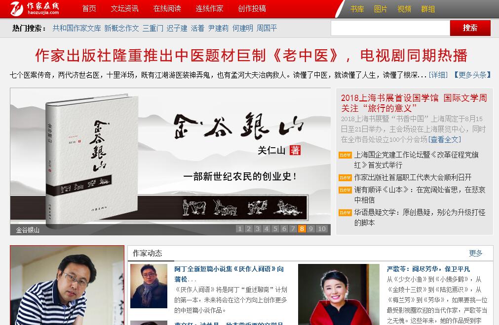 | 网站简介: 作家在线是由中国作家出版集团主办、作家出版社承办运营的文学门户网站,是以作家为核心服务对象的专业文学网站,旨在为所有写作者提供数字化出版平台。网站将充分发挥利用中国作家出版集团各单位的人才优势和内容资源,全力创造网络文学的精品门户,打造网络时代的文学旗舰。作家在线设有文摘资讯、在线阅读、连线作家、写作投稿、网上书店等栏目,为广大读者、文学新人、著名作家等提供阅读写作空间和互动交流平台。作家在线网站能够提供传统图书的增值服务,形成数字出版的开放自主平台,塑造完善的数字出版业务,成长为高品味、权威性的文学门户网站,引领文学发展潮流。 |