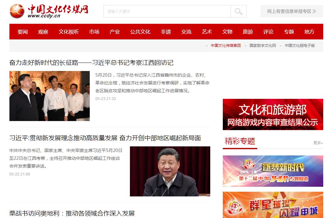 中国文化传媒网(文化传播网)www.ccdy.cn是中华人民共和国文化和旅游部主管、中国文化传媒集团(中国文化报社)主办的大型综合类文化资讯网站。中国文化传媒网(文化传播网)于2000年创办。依托行业媒体强大的采编资源优势和在文化艺术领域所具有的广泛影响力,网站近年来在各类文化资讯网站中脱颖而出,占据权威性地位。随着2009年底中国文化报社作为第一家中央部委主管报社整体转企为中国文化传媒集团,2010年3月,中国文化传媒网(文化传播网)名称正式启用。中国文化传媒网(文化传播网)秉承大文化视野,立足行业,面向社会,为全球用户24小时提供全面及时的文化资讯。网站以原创文化类新闻见长,突出文化艺术领域焦点新闻的深度、广度报道,内容包括权威发布国家文化政策,快速报道全球文化动态,国内外突发文化事件独家报道,文化热点、文化现象解析透视,专家访谈等。树立了坚实的公信力,具有广泛的社会影响,成为社会各界尤其是文化行业首选的信息资讯媒体。中国文化传媒网是国内最大最权威的文化门户类网站,它包含文化要闻、地方新闻、环球视野、剧团院校等26个频道,130个子栏目。通过文、图、音、视频等形式全面展示娱乐、历史、艺术、美术等文化信息。为文化管理者、经营者、文化艺术从业人员以及各界人士提供了工作、学习、生活、娱乐的全方位服务。提供海量文化类资讯,实时反馈当今热点文化现象、解读文化产业、文化法规政策、多形式网民互动、大量原创视频信息报道等都是中国文化传媒网的特色。由文化和旅游部主管,中国文化传媒集团(中国文化报社)主办,中国文化传媒网承办的《中国文化手机报》于2010年7月26日正式创刊。这是全国第一家国家级文化传媒集团主办的第一家文化信息类手机报,是全国文化工作者拥有的第一家文化类新型无线媒体。它将依托国内联通、电信、移动三大电信运营商几乎覆盖全国所有乡镇的电信网络,将国家的文化方针政策、最新发生的文化新闻事件、社会焦点、新鲜文化资讯等送达全国文化系统工作者及全社会关心文化事业的普通用户,特别是最基层的文化馆(站)工作者。中国文化手机报包含焦点新闻、文化大观、文博快讯、演展看台、文化时评、特别关注、地方新闻等十余个栏目。尽揽天下文化新闻。中国文化传媒网(文化传播网)在国家的大力支持与中国文化传媒集团(中国文化报社)的有力领导下,以丰厚的媒介资源和扎实的技术资源、以拼博向上的团队精神,致力于打造中国最大、最全的文化资讯平台,为更多的网友及读者提供更好的用户体验。中国文化传媒网的优势:1、 文化类综合门户网站,高信誉权威媒体;2、 自有的媒体采编资源优势,强调时效性硬新闻和独家原创新闻报道,被众多网络媒体转载;3、 依托行业媒体既有的国内外新闻采集体系,整合全国宣传文化系统资源。通过设在国内各省、自治区、直辖市的中国文化报社记者站,以及与驻外文化机构建立的长期供稿机制,广泛采集第一手的独家信息,专业性和辐射力不断增强;4、 拥有高素质访问人群,网民多为文化艺术行业及相关领域从业人员、艺术品收藏或文艺爱好者,具有良好的文化修养,目标受众清晰,有助于企业针对性地建立营销渠道。