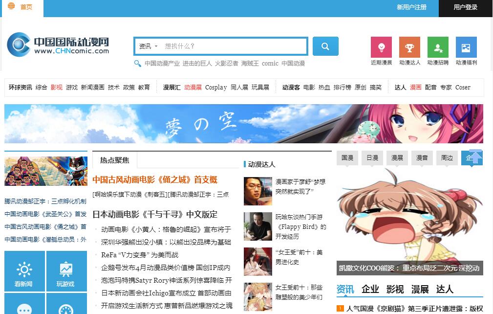 | 网站简介: 中国国际动漫网(www.chncomic.com)作为一家专业的动漫类门户网站,本着立足中国,服务全球的理念,致力于打造国内外行业资讯发布、产业资源对接、行业信息交流以及跨界资源分享四大平台。网站自运营以来,一直为促进中国动漫产业的发展而不懈努力。 |