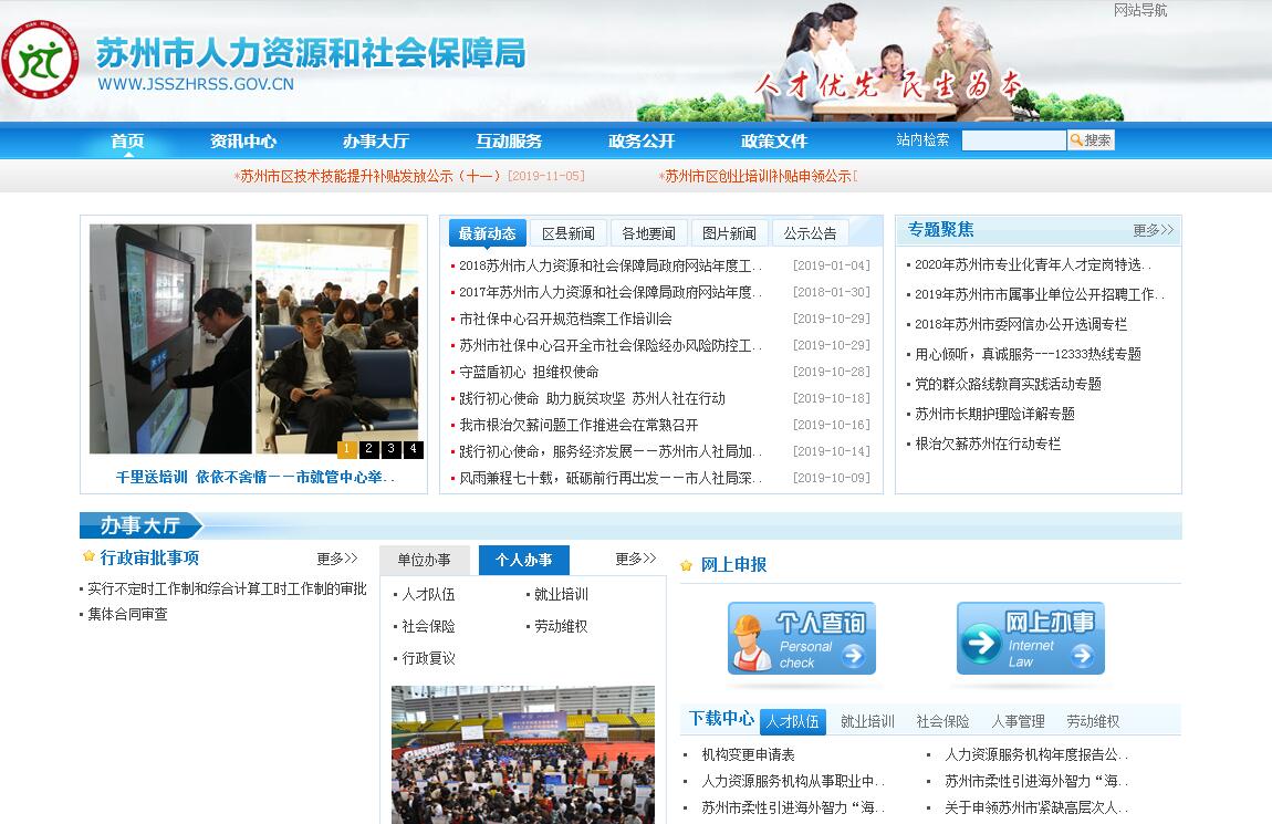 苏州市人力资源和社会保障局,为市政府工作部门,正处级建制。其主要职责是:(一)贯彻实施国家、省人力资源和社会保障事业发展政策法规和规划,拟订全市人力资源和社会保障事业发展政策、规划,起草相关地方性法规、规章草案并组织实施。(二)拟订并组织实施全市人力资源市场发展规划和人力资源服务业发展、人力资源流动政策,促进人力资源合理流动、有效配置。(三)负责促进就业工作,拟订统筹全市城乡的就业发展规划和政策,完善公共就业创业服务体系,统筹建立面向全市城乡劳动者的职业技能培训制度,拟订就业援助制度,牵头拟订全市高校毕业生就业政策,会同有关部门拟订外国人来本市工作政策。(四)统筹推进覆盖全市城乡的多层次社会保障体系。拟订并组织实施全市养老、失业、工伤等社会保险及其补充保险政策和标准。贯彻实施养老保险省级统筹办法和国家、省统一的养老、失业、工伤保险关系转续办法,拟订养老保险市区统筹意见。组织拟订全市养老、失业、工伤等社会保险及其补充保险基金管理和监督办法,会同有关部门审核相关社会保险基金预决算草案,会同有关部门实施全民参保计划并建立全市统一的社会保险公共服务平台。(五)负责全市就业、失业和相关社会保险基金预测预警和信息引导,拟订应对预案,实施预防、调节和控制,保持就业形势稳定和相关社会保险基金总体收支平衡。(六)统筹拟订全市劳动人事争议调解仲裁办法和劳动关系政策,完善劳动关系协商协调机制,拟订并监督执行全市消除非法使用童工政策和女工、未成年工特殊劳动保护政策,贯彻落实职工工作时间、休息休假和假期制度。组织实施劳动保障监察,协调劳动者维权工作,依法查处重大案件。完善全市人力资源和社会保障系统信访工作制度。(七)负责全市人力资源开发工作,参与人才管理工作,牵头推进深化职称制度改革,拟订全市专业技术人员管理、继续教育和博士后管理等政策,负责高层次专业技术人才选拔和培养工作,拟订吸引留学人员来本市工作或定居政策。组织拟订全市技能人才培养、评价、使用和激励制度。完善职业资格制度,健全职业技能多元化评价政策。(八)会同有关部门指导全市事业单位人事制度改革,按照管理权限负责规范事业单位岗位设置、公开招聘、聘用合同等人事综合管理工作,拟订事业单位人员管理政策。会同有关部门拟订机关、事业单位公益性岗位人员管理政策并组织实施。(九)组织实施国家和省表彰奖励制度,会同有关部门拟订全市表彰奖励制度,综合管理全市表彰奖励工作,根据授权承办以市委、市政府名义开展的表彰奖励活动。(十)会同有关部门拟订事业单位人员工资收入分配政策,建立企事业单位人员工资决定、正常增长和支付保障机制。拟订企事业单位人员福利和离退休政策。 (十一)会同有关部门拟订全市农民工工作的综合性政策和规划,推动相关政策落实,协调解决重点难点问题,维护农民工合法权益。(十二)负责人力资源和社会保障领域对外交流与合作工作。(十三)完成市委、市政府交办的其他任务。