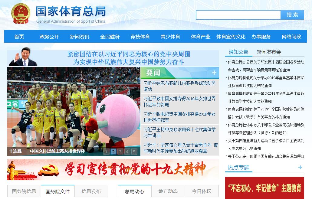| 网站简介: 国家体育总局主要职责:一、研究体育发展战略,协调区域性体育发展,负责推动多元化体育服务体系建设,推进体育公共服务和体育体制改革。二、拟订体育事业发展规划和政策,起草有关法律法规草案并督促实施。三、统筹规划群众体育发展,负责推行全民健身计划,监督实施国家体育锻炼标准,推动国民体质监测和社会体育指导工作队伍制度建设,指导公共体育设施的建设,负责对公共体育设施的监督管理。四、统筹规划竞技体育发展,设置体育运动项目,指导协调体育训练和体育竞赛,指导运动队伍建设,协调运动员社会保障工作。五、统筹规划青少年体育发展,指导和推进青少年体育工作。六、拟订体育产业发展规划、政策,规范体育服务管理,推动体育标准化建设,负责体育彩票发行管理。七、指导、管理体育外事有关工作,组织开展国际间和与港澳台的体育交流与合作。八、组织开展体育领域重大科技研究、技术攻关和成果推广。九、负责组织、协调、监督体育运动中的反兴奋剂工作。十、承办国务院交办的其他事项。 |