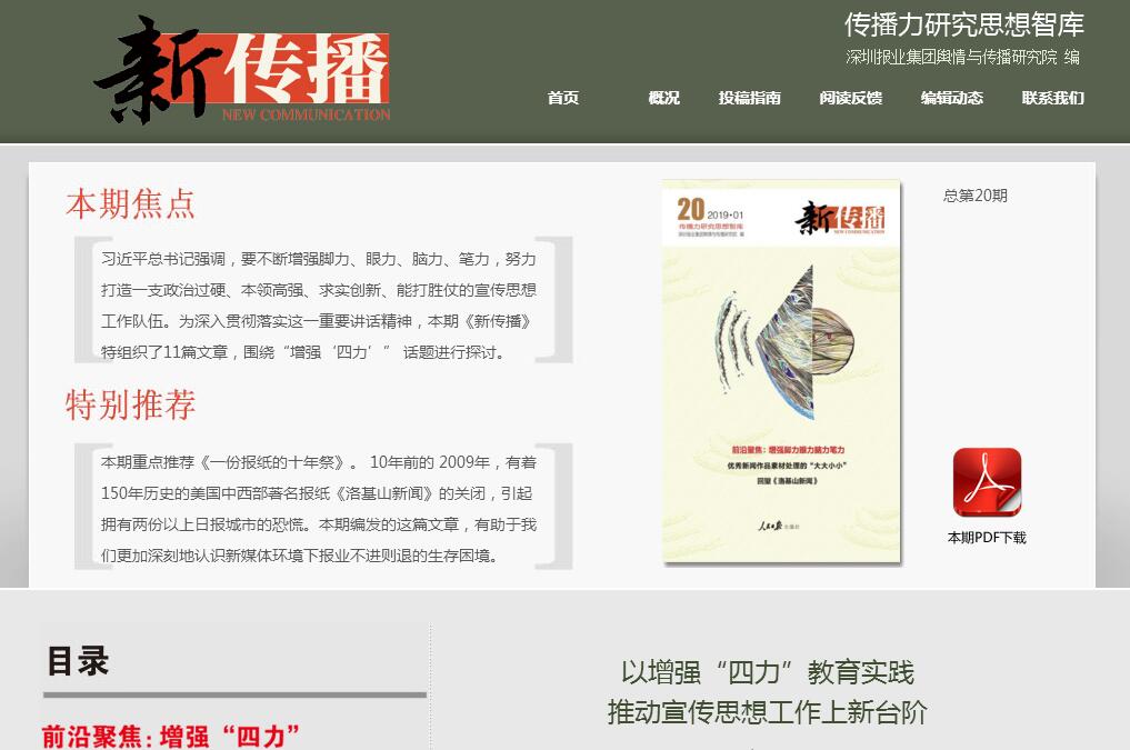 | 网站简介: 新传播电子版。《新传播》是深圳报业集团2014年3月创刊的新闻专业理论期刊,由深圳报业集团新闻研究所编。 |
