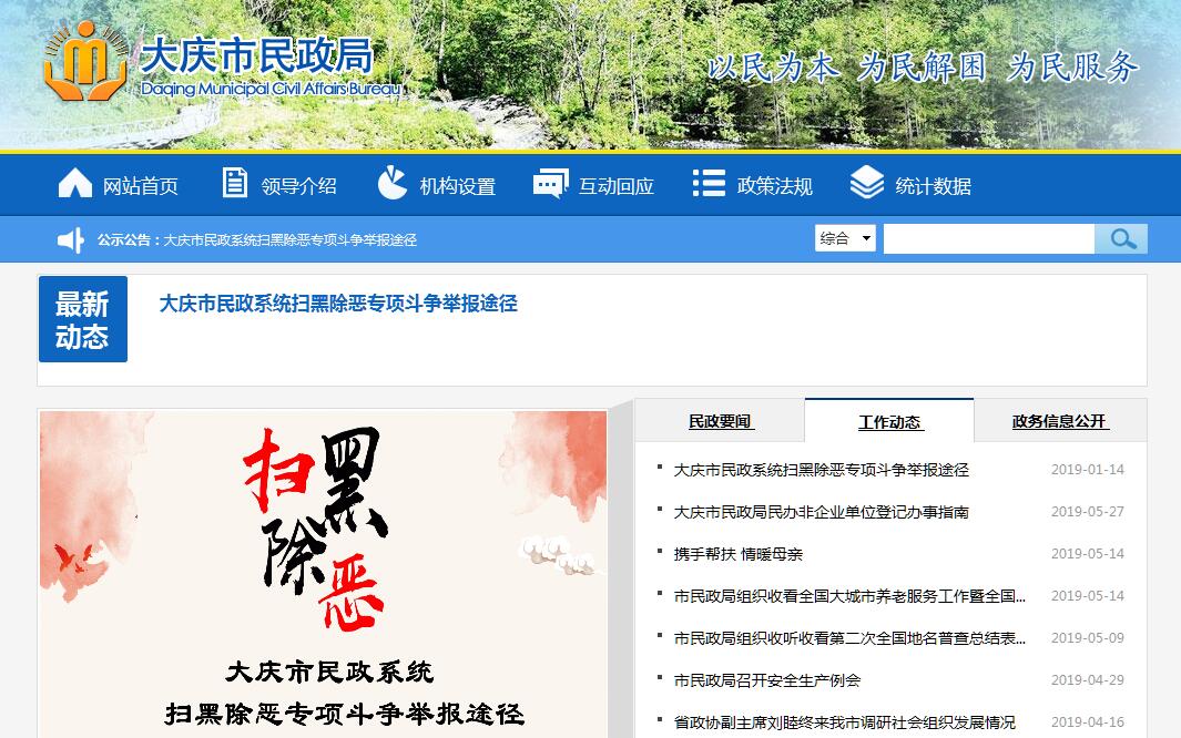 大庆市民政局主要职责:(一)贯彻实施党和国家、省关于民政工作的方针政策和法律法规;根据国家、省民政事业发展规划,编制民政事业中长期发展规划,制定年度工作计划;拟订民政工作相关政策和规范性文件并组织实施和监督检查。(二)承担依法对市管社会团体、民办非企业单位等登记管理和监察的责任;承担指导和监督各县(区)对社会团体和民办非企业单位的登记管理责任;承担对非法民间组织的执法监察工作;指导县(区)民间社会团体、民办非企业单位的登记、年检和执法监察工作。(三)组织和指导拥军优属工作;负责优抚对象的优待、抚恤和补助工作;负责革命烈士的审核、申报和褒扬工作;负责退役军人、国家机关工作人员等残疾等级报批并承担伤亡抚恤工作;承担革命烈士纪念建筑物的建设及管理工作;承担市拥军优属拥政爱民工作领导小组日常工作。(四)承担退役士兵、转业士官、退休士官、复员干部和移交地方政府安置的军队离退休干部以及军队无军籍退休退职职工的接收安置责任;拟订退役士兵、转业士官、退休士官、复员干部和移交地方政府安置的军队离退休干部以及军队无军籍退休退职职工的接收安置和服务管理政策并组织实施;负责退役士兵的技能培训和中介工作;指导军供工作。(五)拟订全市救灾减灾政策、规划并协调组织实施;建立和完善自然灾害救助应急体系;负责核查、统计、上报自然灾害灾情;组织、指导救灾捐赠工作;接收、管理、分配救灾款物并监督使用;承担市减灾委员会办公室工作。(六)牵头拟订社会救助规划、政策和标准并组织实施,健全城乡社会救助体系;承担城乡居民最低生活保障、城市低收入家庭认定、五保供养、敬老院建设管理、临时救助和医疗救助工作;提出最低生活保障资金和社会救助资金安排建议;参与拟订住房救助、教育救助、司法救助、城镇居民基本医疗保险和新型农村合作医疗等相关政策;承担社会救助信息管理工作。(七)提出加强和改进城乡基层政权建设的建议;牵头推进城乡社区建设工作和社区服务体系建设,负责基层群众自治组织建设;负责村民委员会组织法和居民委员会组织法的贯彻实施;指导村(居)委会换届选举;指导村民和居民自治活动,推动基层民主政治建设工作;牵头组织指导村务公开、民主管理和乡镇政务公开工作。(八)承担推进婚姻和殡葬习俗改革工作;负责收养登记工作;指导婚姻、殡葬和生活无着人员救助服务机构管理工作。(九)规范和指导县(区)行政区划管理工作;负责县(区)、乡(镇)的设立、撤销、调整、更名和界线变更的审核和申报;承担指导县(区)行政区域界线的勘界工作,调处行政界线争议。(十)承担地名管理工作责任;贯彻实施国家、省、市地名管理有关法律法规,制定具体实施办法;规范地名标志设置和管理工作,推行地名标准化管理。(十一)拟订社会福利事业规划并组织实施;负责社会福利企业审批和管理工作;指导各类福利设施建设和福利事业单位及农村敬老院的服务管理工作;指导和落实老年服务工作;推动社会福利社会化体系的建立与发展;负责社会福利资金的募集工作;组织、指导社会捐助工作;负责社会福利有奖募捐工作。(十二)承办市政府交办的其他事项。
