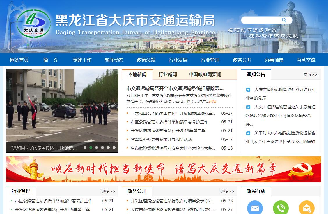 大庆市交通运输局主要职责:(一)承担涉及综合运输体系的规划协调工作,会同有关部门组织编制综合运输体系规划,指导交通运输枢纽规划和有关管理工作。(二)贯彻执行国家公路、水路行业发展战略、方针政策和法律法规;组织拟订公路(含油田专用公路)、水路行业政策、规划和标准并监督实施;参与拟订我市物流业发展战略和规划,拟订有关政策和标准并监督实施;指导公路、水路行业有关体制改革工作。(三)承担道路、水路运输及城市客运市场监管责任。拟订道路、水路运输及城市客运有关政策、制度和运行规范并监督实施;指导城乡客运及有关设施规划和管理工作,指导客运出租汽车行业管理工作。(四)按照市政府规定的权限提出规划内和年度计划规模内交通固定资产投资项目审查意见;提出有关财政、土地、价格等政策建议。(五)承担公路、水路建设市场监督责任。拟订公路、水路工程建设相关政策、制度和技术标准并监督实施;承担公路、水路有关工程建设质量、安全生产监督管理工作;指导港口规划和岸线使用管理工作。(六)组织实施公路、水路交通工程建设;指导公路、水路交通运输基础设施建设、管理和维护,承担有关交通重要设施管理和维护;组织实施战备公路、水路建设、维护,承担国防动员有关工作。(七)指导公路、水路行业安全生产和应急管理工作。依法组织或参与事故调查处理及水上救助打捞工作;按规定组织协调重点物资和紧急客货运输;负责市内干线公路网运行监测和协调工作。(八)指导交通运输信息化建设,监测分析运行情况,开展相关统计工作,发布有关信息;指导公路、水路行业环境保护和节能减排工作;负责公路、水路对外合作与外事工作。(九)负责道路、水路、公路、航道、港口、城市公交、汽车租赁的行政管理;参与交通战备工作;负责对外沟通协调辖区内铁路运输和大庆萨尔图机场管理外部监督职责。(十)承办市政府交办的其他事项。