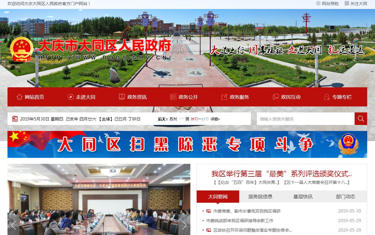 | 网站简介: 大同区是黑龙江省大庆市的一个市辖区,位于大庆市西南部。大同地处松嫩平原西部,大庆市区南部,是五个行政区中最大的区。幅员2235平方公里,人口25万(2004年),有汉、满、蒙等18个民族。下辖8个乡镇,58个行政村,315个自然屯,6个街道办事处,18个社区。2019年3月,被水利部公布为第一批节水型社会建设达标县(区)。 |