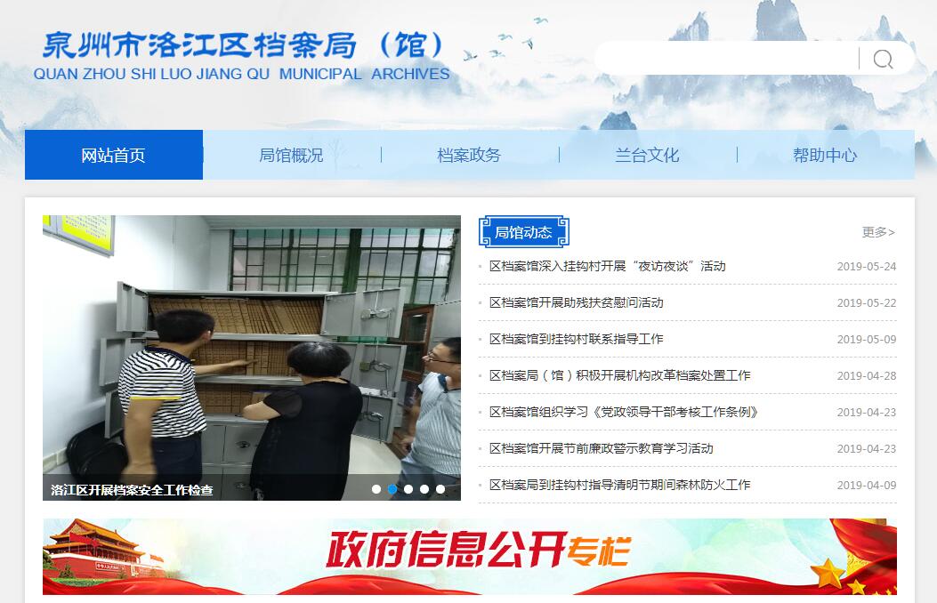 泉州市洛江区于1997年6月经国务院批准设立。同年8月从原鲤城区档案馆分流2名工作人员到洛江区组建新区档案馆。1998年1月13日正式设立了“泉州市洛江区档案馆”,加挂档案局牌子,为区委直属正科级事业单位,核定编制4人。2000年12月,区委同意将区档案馆列入参照国家公务员制度管理范围。其主要职责是:1、贯彻实施《档案法》及档案工作的法律、法规和方针政策,进行行政执法监督;制定实施全区档案事业发展规划和档案工作制度。2、审批外国组织和个人以及华侨、港澳台同胞利用区档案馆馆藏档案的申请。3、调查处理违法案件,监管对国家和社会具有保存价值或应当保密的集体和个人的档案。4、对全区机关、团体、企事业单位和其他组织的档案工作进行监督和指导,对档案人员进行业务培训,组织全区档案信息资源开发工作。5、集中统一管理区级各机关、团体及所属单位重要的档案资料,保守党和国家机密,维护档案的完整,确保档案资料的安全。6、负责接收区级各机关、团体及所属单位的档案资料,研究并组织实施馆藏档案的保管、整理、编目、统计、鉴定、解密、利用、开放等工作;做好档案史料的编辑出版工作,推进档案工作的科学管理和现代化建设,为社会各方面提供服务。7、完成区委、区政府及上级档案部门交办的有关事项。