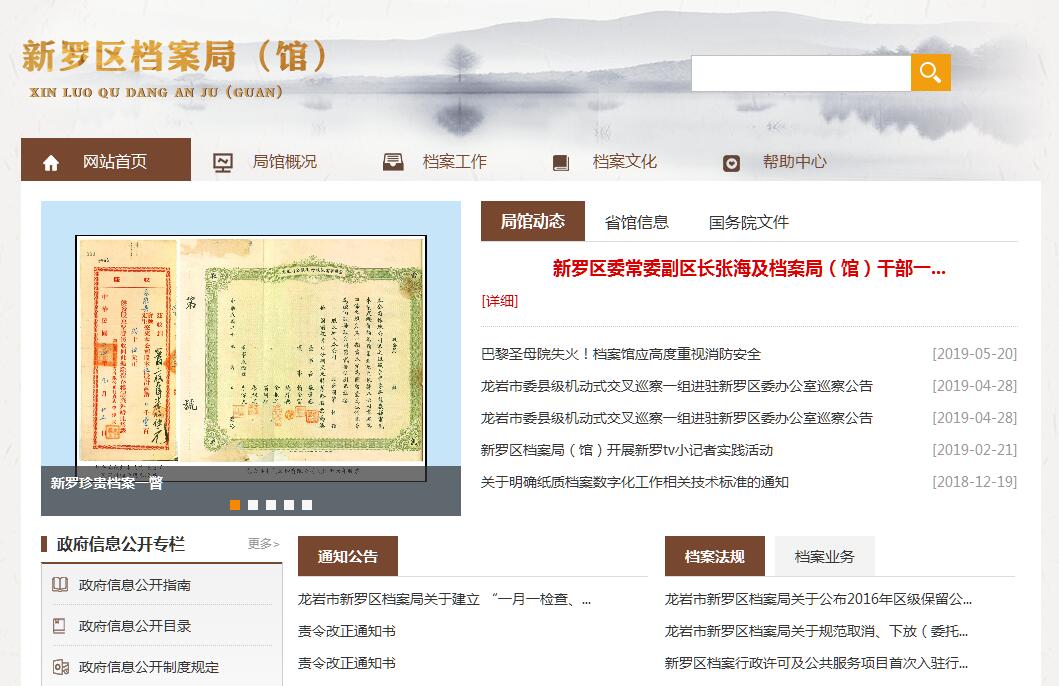 龙岩市新罗区档案局(馆)成立于1958年12月11日,是中共龙岩市新罗区委、新罗区政府直属的文化事业机构,是集中管理区直机关、团体、乡镇(街道)、部分企事业单位需要永久、长期保存的档案和有关资料的国家综合档案馆。龙岩市新罗区档案局成立于1981年5月,是新罗区政府的档案行政管理部门,主管全区的档案事业,并对本行政区域内机关、团体、企事业单位和其他组织的档案工作实行监督和指导。龙岩市新罗区档案局与区档案馆合署办公,两块牌子,一套人马,是列入党委系列管理的正科级事业单位。局馆内设综合股、监督指导股、保管利用股。龙岩市新罗区档案馆设在区政府大院内。2001年11月搬迁使用的新档案馆总建筑面积3665平方米,共7层。新档案馆大楼按国家标准设计建筑,办公用房与档案用房相配套,其中:档案馆使用4层,面积为2094平方米;办公室设在2层,查档利用工作室和计算机房设在4层,档案库房设在3至5层。库房配有空调机、抽湿机、吸尘器等,档案温湿度控制面积达100%,基本达到了档案保护的“八防”要求。大楼安装了自动消防报警和自动防盗报警系统。局馆内还配置了计算机12台,以及复印机、电视机、放像机、数码相机和防磁柜等保护、利用档案的现代化设备。龙岩市新罗区档案馆是我区集中保管和利用档案资料的中心,本局馆将积极发挥档案的作用为各级领导决策服务,为各部门工作服务,为人民群众服务。