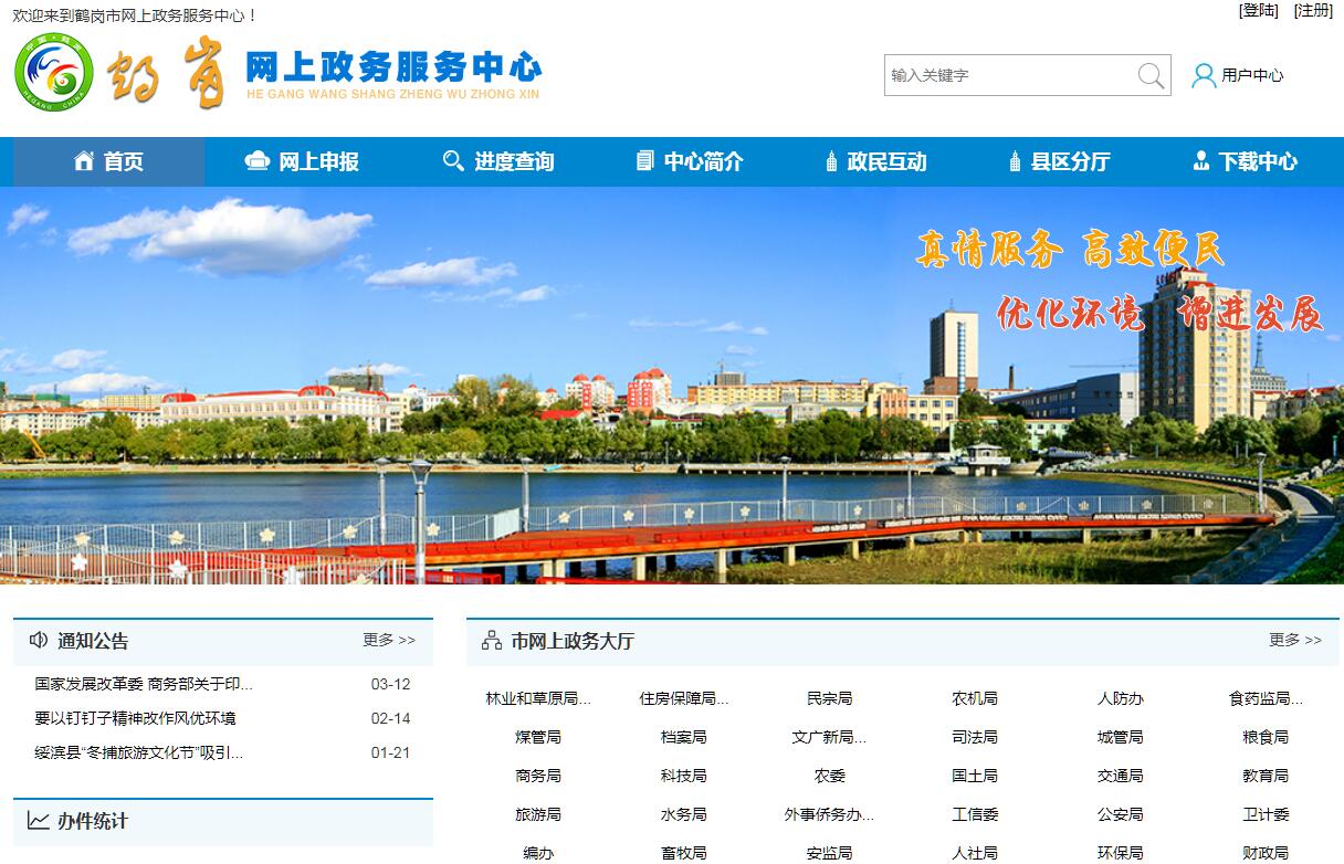 鹤岗网上政务服务中心是鹤岗市政府为改善经济社会发展环境打造的覆盖市县区统一的网上审批综合服务平台。旨在通过平台实现规范权力运行,强化权力监督,提高行政效能,方便企业和个人办事。该中心由审批业务系统、电子监察系统和法制监督系统三大系统及政府信息公开系统、中心门户网站组成,实行一个中心受理,两个系统监督的架构。目前,我市38个部门的309项行政许可事项均可通过该系统进行申报、办理。中心服务宗旨:“集中、透明、规范、高效”。中心工作制度:一次性告知制度;限时办结制度;督办催办制度。中心的便民措施:审批事项全面公开、24小时远程办理、网上缴费、实时在线答疑、关键节点短信提醒、及时查询办理状态、全流程计时监督、原件邮寄提交、打印、输出、电子审批专用章、投诉举报公开处理。中心设置的栏目功能:搜索、网上申报、网上公示、网上咨询、投诉举报、政策法规、帮助手册、下载中心、并联审批、办件查询、办件统计。中心办事程序:首先进行用户注册,通过密码登陆中心,点击“搜索”、“省直单位”或“事项类别”进入相应部门的审批事项列表,查看《一次性告知单》详尽信息。按照要求填写申请书、上传附件材料,系统接收材料后,通过申请编号查询事项办理状态,关注事项的办理进程。通过网上咨询与帮助手册了解更多疑难问题。中心承诺:打造依据合法、流程清晰、公开透明、接受监督的中心平台,以“集中、透明、规范、高效”为宗旨,竭诚为企业和个人提供优质高效服务。