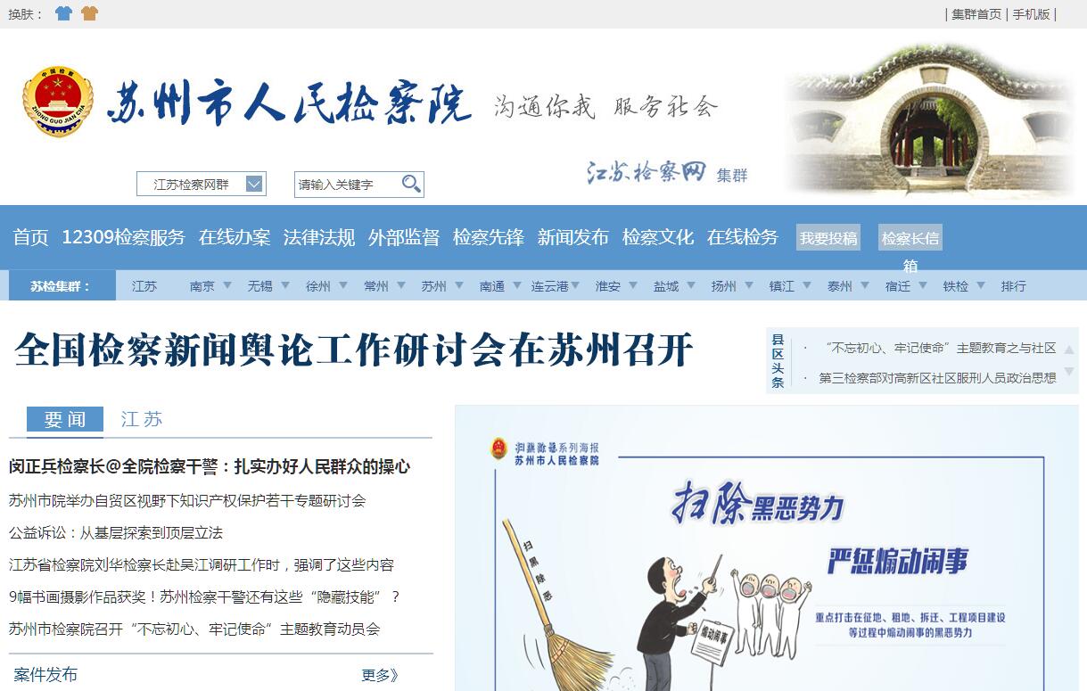 近年来,苏州市检察机关紧紧围绕改革发展大局,确立了“为民服务、为党分忧”的工作宗旨和“全省第一、全国一流”的争创目标,依法全面履行检察职能,积极稳妥推进司法体制改革,扎实推进过硬检察队伍建设,为苏州争当“强富美高”新江苏建设先行军排头兵提供了有力的司法保障。目前,苏州市检察院下辖10个基层院,即张家港、常熟、太仓、昆山4个县级市检察院,吴江、吴中、相城、虎丘、姑苏、工业园区6个区检察院。全市检察机关共有政法专项编制1252个,现有工作人员1655人,其中属政法专项编制的1076人。检察干警中博士研究生1人、硕士研究生403人,本科以上学历的占97.1%。派驻乡镇检察室23个。市检察院有政法专项编制210个,现有工作人员264人,其中属政法专项编制的177人,聘用制书记员19人,工人8人,公益性岗位60人;领导班子成员7人,一名副检察长兼任姑苏区院检察长;改革试点前具有助检员以上法律职务的151人,占实有干警总数的77.4%,其中检察员78人。2016年确立了首批员额检察官432名,占政法专项编制的35%(现有员额检察官419名,占政法专项编制的34%)。苏州地处长三角地区中心城市,每年刑事案件总量约1.5万件,外来人口占比约80%,新类型案件、重大敏感案件较多,全市两级院以约占全省8%的检察人员办理了约占全省20%的案件,检察官人均办案量居全省首位。每年立案查办贪污贿赂案件150人左右、渎职侵权犯罪案件30人左右,诉讼监督成效明显,获得了各级领导的肯定和认可。苏州市检察院3次获全国基层检察院建设组织奖,6次获全省基层检察院建设组织奖,荣获首届全国检察文化建设示范院,获评苏州市人民满意的公务员集体。全市涌现1家全国十佳检察院及“四化建设”示范院,5家全国先进基层检察院,6家全省先进检察院。苏州检察机关涌现出全国模范检察官、全国先进工作者王勇、首届“全国检察机关刑事执行检察业务标兵”张鑫、优秀援疆干部唐彬斌等一批政治坚定、业务过硬的“明星检察官”。全市两级院拥有全国十佳公诉人、全国侦查监督办案能手、全国检察理论研究人才等20名省级以上优秀专业人才,每年有140多个集体或个人受到市级以上表彰。