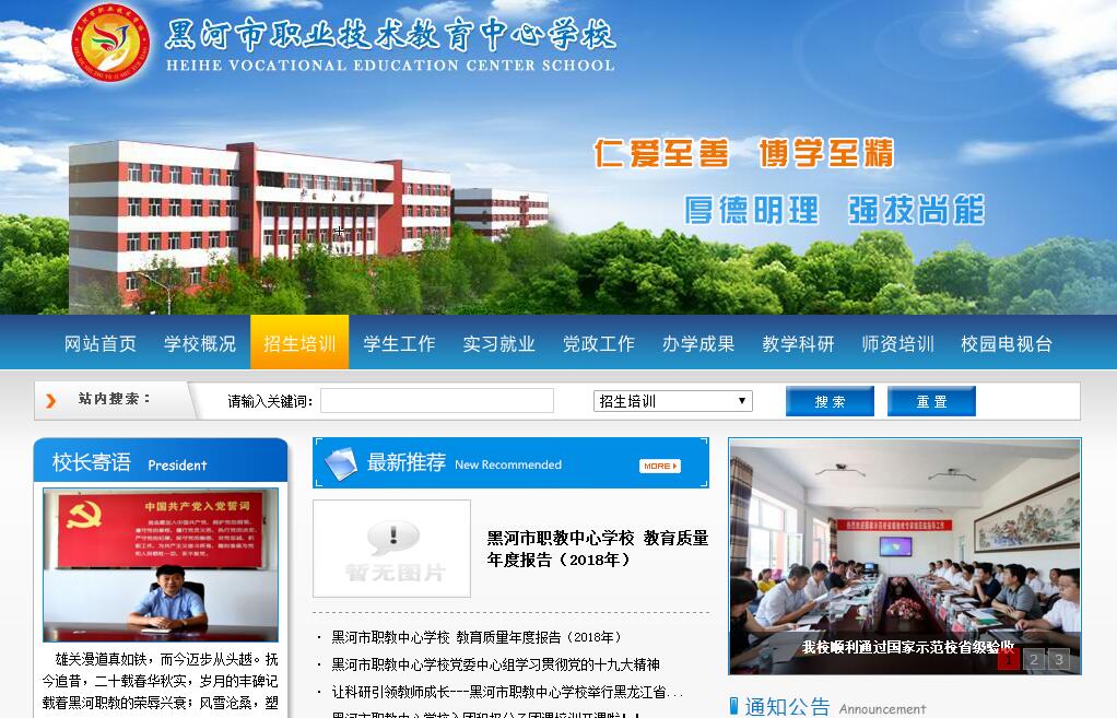 黑河市职教中心学校成立于1996年,是我国北端边境线上唯一一所国家级重点中等职业学校,是对俄罗斯的窗口学校,是一所集普通中专、职业高中、技工教育、成人专本科函授及各类短期培训为一体的多功能、多形式的中等职业学校。 学校占地326.4亩,建筑面积7.4425万平方米。学校现有教职工297人,专任教师199人,其中副高级职称教师105人,“双师型”教师109人,有国家级职教名师1人,省级专业带头人11人,市级专业带头人4人,市级骨干教师8人。现有在校生5311人。 学校依据区域经济、产业结构调整及经济发展方式的转变,淘汰饱和专业,发展护理、计算机、商务俄语、俄语护理、烹饪、电子技术应用、工艺美术、森林管护等骨干和特色专业,嫁接了以护理、计算机为骨干专业群的中医护理、计算机网络技术、计算机平面设计等复合专业。学校现有医护、计算机、机电、旅贸商、艺术、农林六大类实训基地,其中计算机专业实训基地为国家级实训基地,护理专业实训基地有省内一流的解剖标本室、先进的医学机能虚拟实验室、各种先进的临床护理模型,商务俄语专业有现代化的语音室,电子技术应用专业有先进的电气运行实训室、电子整机实训室,幼儿教育专业有一流的电钢琴室、电子琴室,共有实训室41个。同时学校还与黑河市第一人民医院等9家二级乙等以上医院建立了医护类校外实训基地,与黑龙江省通信公司黑河分公司、哈尔滨奔图数码科技公司、北方水泥有限公司、黑河热电厂、黑河市实验幼儿园、教育幼儿园、华富量贩、商贸大酒店、国际饭店等34家企业建立了实训基地。分别接纳计算机网络技术、电子技术应用、幼儿教育、商务俄语、烹饪、工艺美术等专业学生实训。 15年来,学校为地方经济发展培养了20000多名实用技术人才,有500多名中职生对口升入专本科院校,完成社会培训10万人次,培养的实用技术人才遍布全市各行各业,60%以上的毕业生成为一线业务骨干,医护专业的毕业生占全市医疗卫生单位医护人员的70%。1999年,被黑龙江省教委授予“黑龙江省教育系统教书育人、管理育人、服务育人先进集体”;2000年,晋升为国家级重点校,被黑河市政府命名为市级文明单位;2002年,被黑河市政府命名为市级文明单位标兵;2004年,被黑龙江省教育厅指定为“全省农村劳动力转移教育培训基地”;2005年,被黑龙江省教育厅评为省级重点中等职业学校;2006年,被黑龙江省人民政府授予职业教育先进单位。 学校党委抓住职业教育的大好形势,调整办学方向,重新进行定位,提出了“以市场为导向,以服务为宗旨,以就业为目的,以能力为本位,以质量求信誉,以特色求发展,服务社会经济、服务学生就业”的办学理念;确立了“以更新观念为前提,以创新为动力,以改善办学条件和强化师资队伍建设为基础,以科学管理和优质服务为手段,以提高教学质量为核心,以实现升学和就业为目的,增强学校主动服务经济社会和学生需求能力,使学校逐步走上招生、教学、管理、服务、就业相互促进,质量、规模、效益、特色相互统一的良性循环轨道”的办学指导思想。全校教职工在学校党委的正确领导下,正以饱满的工作热情和对职业教育的无限忠诚,为创建国家级中职示范校而努力!