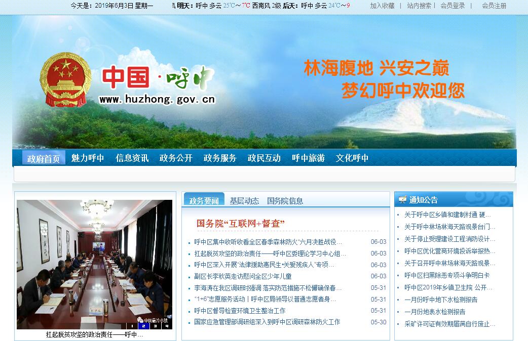 呼中区(呼中林业局)位于黑龙江省西北部大兴安岭伊勒呼里山北麓,是中国的偃松之乡、寒带黑木耳之乡,红毛柳之乡。境内千米高山达800多座,平均海拔810米左右,无霜期仅有83天,年平均气温-4.3℃,历史最低气温达-53℃,呼中区呼中镇是“中国最冷小镇”。四季风光秀美。先后被评为中国最美秋色、中国最具吸引力的地方。境内有AAA级国家景区白山景区、中国最北的呼中区国家级森林公园、呼中区国家级自然保护区,有中国海拔最高、省级地质公园苍山石林,中国最北的氡泉,有中国北极第一峰大白山、呼玛河源头漂流、水帘洞等旅游景观。 历史文化厚重。目前已发现4处30多幅的岩画,特别是黑龙山龙首洞的门楣漫涣岩画,经北大科技考古测定为距今2500年的西周时期,洞内岩壁上清理发现人工绘制残存的红褐色彩绘遗痕,在世界岩画研究中极为罕见,测定为10000年左右的旧石器晚期。洞内的八个叠压紧密的地层,是黑龙江目前地层最丰富的旧石器地层,证明该山洞自旧石器至鲜卑时期一直存在人类活动遗迹,证实大兴安岭与长江,黄河,草原一样成为中华文明的发祥地之一。物产资源丰富。施业区经营总面积为77万公顷,人口5万余人。森林覆盖率为96.24%,活立木蓄积量为6459万立方米。有落叶松、樟子松、偃松等树种;林中有紫貂、水獭、猞猁、棕熊等79科307种野生动物;有蓝莓、灵芝、黄芪等600多种山野果和山药材;区局地处德尔布干富矿带中部,现已初步探明地下蕴藏着丰富的铁、铅、锌、铜、钼、金、银、麦饭石等多种矿藏。发展步伐坚实。自1965年开发建设到2014年4月1日停止商业性采伐,累计向国家提供商品材2027万立方米,为国家作出了巨大贡献。近年来,围绕地委“把资源管起来、让百姓富起来”发展战略,明确了“保生态、惠民生、促发展”的工作目标。生态效益不断增加,松杉灵芝、偃松果、“中国第一家”呼中牌麦饭石木耳享誉全国,旅游产业日渐壮大,矿产开发逐步推进,百姓生活更加幸福,先后有40余项工作受到国家、国家林业局、省、地的表彰, 2010年被省授予“十佳和谐企业”称号;2012年荣获国家级森林防火先进单位,2015年被评为全国文明单位称号。呼中区(呼中林业局)物产丰饶、环境优美、商机无限,真诚欢迎各界宾朋走上高高的兴安之巅,共谋发展,共创更加美好的明天!
