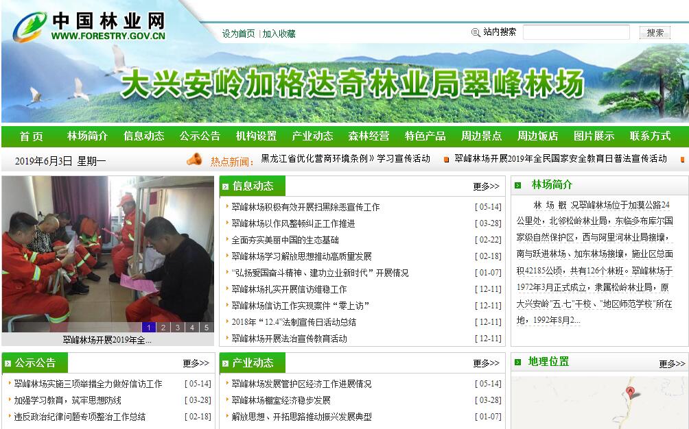 翠峰林场位于加漠公路24公里处,北邻松岭林业局,东临多布库尔国家级自然保护区,西与阿里河林业局接壤,南与跃进林场、加东林场接壤,施业区总面积42185公顷,共有126个林班。翠峰林场于1972年3月正式成立,隶属松岭林业局,原大兴安岭"五.七"干校、"地区师范学校"所在地,1992年8月20日归属加格达奇林业局。翠峰林场于2001年停止采伐,现在工作的中心以资源管护、森林防火、营林生产、多种经营和旅游服务为主。林场现有职工105人,其中:督导员5人、管理人员12人、卫生员1人、管护人员58人、扑火队员25人,瞭望员4人;林场设有二个瞭望塔:05塔587高地翠古1公里和21塔(借用)1025高地翠西38公里;九个资源管护站,分别在:翠古公路0公里、3.5公里(无站舍),翠西公路0公里、9公里、19公里、41公里,加漠公路8公里、12公里、14公里、17公里处;三条公路贯穿整个施业区,分别为:加漠公路长16公里、翠古公路长5公里,翠西公路长45公里;百谷泉景区位于翠峰林场施业区内,这里原始森林生态优良、天台山祭天岩画国内罕见、远古湿地生机盎然,基本涵盖了大兴安岭的所有动植物种类,有益的植物芬多精、负氧离子的含量达城区的近千倍,景区内有200余处天然山泉多数含氡,是罕见的氡泉富集区,同时也是难得的旅游康养胜地。翠峰林场党支部共有党员24名,入党积极分子4名。党支部认真贯彻党十九大精神,积极推进"两学一做"学习教育常态化制度化,不断在真"学"实"做"上深化拓展。先后被上级部门评为省级文明单位、省级安全文明单位、省级生态林场、地区先进基层党组织、地区文明单位标兵、地区社会治安综合治理先进单位、地区计划生育先进单位、地区防火工作先进单位、局先进基层党组织、局党风廉政建设先进集体、局防火工作先进单位、局"三八"红旗集体等荣誉称号。