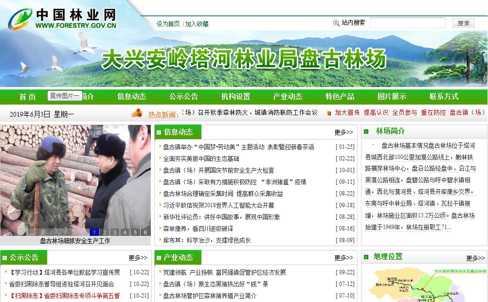 盘古林场位于塔河县城西北部100公里加漠公路线上,嫩林铁路横穿林场中心,盘沿公路经盘中、沿江与黑漠公路相连,盘碧公路与呼中碧水镇相通,西北与漠河县、塔河县开库康乡交界,东南与呼中林业局、塔河镇、瓦拉干镇接壤,林场施业区面积15.2万公顷。盘古林场始建于1969年,林场在册职工714人,青工413人,退休职工443人。2010年8月省政府启动了百镇建设第一批48个试点镇,盘古镇被列其中之一。同时棚户区一期改造工程落实在盘古5万平方米,当年完成。二期于2011年落实了3万平米,现盘古镇平房改造工程已全面完成,共改造321栋1383户,盘古镇户籍人口5655人,2015户。盘古镇居民住宅均为平房,一马路是黑色7米宽路面1.5km,二马路是6米宽水泥路面1.3km,贮木场进场路1km,连接一、二马路巷道三条0.9km,其它主次干道43km,均是沙石路,其中主干道15km、次干道28km。2012年,盘古林场在塔河林业局的正确领导下,始终坚持以科学发展观为指导,以"创新企业管理,转变企业职能,降低企业成本,提高企业效能"为主题,以保增长、保民生、保稳定为重点,以开展创先争优活动为动力,进一步转变工作作风,提升执政效能,强化绩效考核,较好地完成了林业局下达的各项工作任务。推动了盘古林场生态型花园式新林区建设整体的升级。