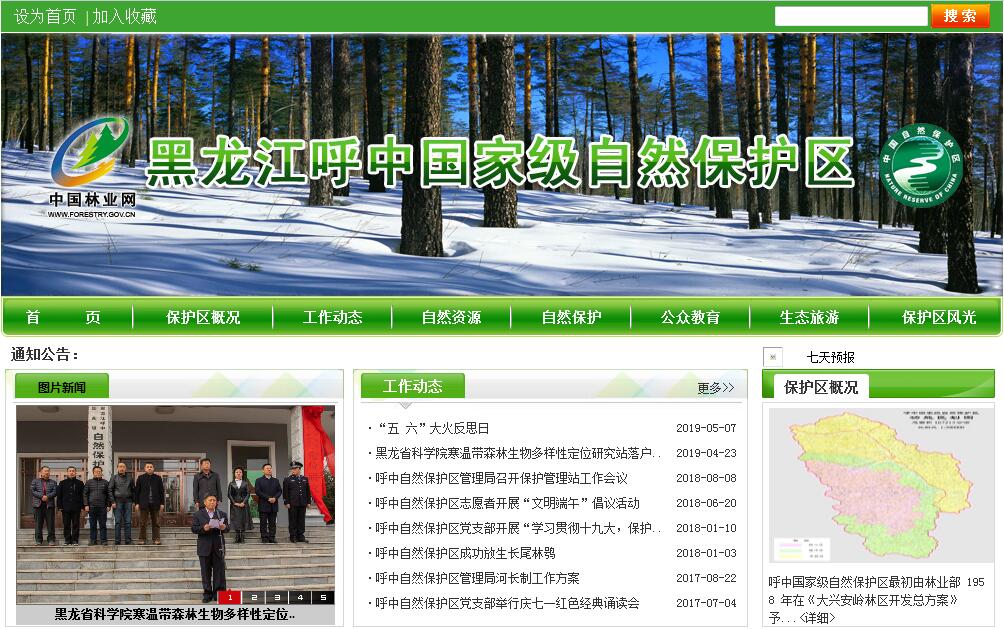 黑龙江呼中国家级自然保护区最初由林业部 1958 年在《大兴安岭林区开发总方案》予以规划确定, 1988 年国务院以国发 [1988]30 号文件确定为第二批国家级森林和野生动物类型自然保护区。 1992 年 2 月 28 日 原林业部世界自然基金会( WWF )在北京召开“中国自然保护优先领域研讨会”一致认为呼中国家级自然保护区具有国际保护意义(A级)。在中国具有国际的 40 个自然保护区中列第五位。保护区建立的较早,但管理机构设立和开发建设工程启动较晚。 1993 年国家林业部以林计批字 [1993]138 号文件,批准建立呼中国家级自然保护管理处。呼中国家级自然保护区位于黑龙江省大兴安岭地区,地处大兴安岭主脉和伊勒呼里山所夹成的东北坡(其地理坐标为东经 122 ° 42 ′ 14 ″ — 123 ° 18 ′ 05 ″,北纬 51 ° 17 ′ 42 ″— 51 ° 56 ′ 31 ″ )。保护区是我国最北部面积最大的森林和野生动物综合类型自然保护区,保护区南北长约 63 公里 ,东西宽约 32 公里 ,总面积为 167213 公顷 。其中,核心区面积 54087 公顷 ,实验区面积 67633 公顷 。缓冲区面积 45493 公顷 。主要保护对象是寒温带针叶林生态系统,野生动物和自然景观。保护区的地貌属于中低山冰缘(或冻土)地貌。在地形地势上保持着中生代以来的基本轮廓。构成本区山体的主要岩石为花岗岩、石英粗面岩、玄武岩、石英斑岩等。地势总的趋势是西高东低,山峦连绵,地势起伏,海拔高度多在 800-- 1200 米 之间。区内土壤共分为四类,具体为:棕色针叶林土、草甸土、沼择土和石质土。保护区内河流属黑龙江水系,是呼玛河的发源地。区内河网溪密布,呼玛尔河、加占多拉玛鲁河、沙诺杭纳霍马鲁河、山洛杭纳霍马鲁河分别发源于保护区西北、西南,在中部,汇合成呼玛河后,向东北流去注入黑龙江。本区的水量丰枯,水位高低变化随季节面异。一般以冬季 水位最低,夏中时水位最高。由于森林植被及其凋落层阻碍了地表径流和雨水的蒸发,使地下水冻结层上水资源和冻结层下水资源保护区属于寒温带大陆性季风气候,季节温差大,冬季漫长寒冷且大量积雪,夏季短暂温暖面多雨,春秋两季明显,表现为春季温度骤升、秋季温度骤降。一年四季和昼夜温差较大。保护区年平均气温为- 4 ℃ 。极端最低气温达- 47.4 ℃ ,极端最高气温为 32.0 ℃ 。最冷月为1月份,平均气温为- 35.8 ℃ ;最热月为7月份,平均气温 24.5 ℃ ,气温年较差达 60 ℃ 以是保护区年平均降水量 458.3 毫米 。保护区年相对湿度平均为71% 。年蒸发量平均为 911 毫米 。保护区冬季多为西风或西北风,夏季常为南风或东南风,春秋两季为西北风和西南风。本区无霜期一般在 80 - 100 天之间,早霜多见于9月上旬,晚霜多见于5月下旬,植物生长期为 100 天左右。保护区在植物地理区划上,隶属于泛北经植物区、欧亚森林植物亚区、大兴安岭地区。区内山峦叠翠,海拔高度较高,森林植被垂直分布明显,森林植被保持着原始状态,是我国北方寒温带明亮针叶林生态系统的代表。保护区植物种类繁多,在大兴安岭地区具有较高的代表性。据调查统计,保护区内共有植物种类 248 种分属 58 科 156 属,其中苔藓植物 13 种,蕨类 7 种,裸子植物 5 种,被子植物 223 种。保护区的野生动物依全国动物地理区划属古北界——东北亚界——东北区——大兴安岭亚区。据调查保护区内共有野生动物(脊椎动物) 50 科 178 种,其中鸟类 131 种,兽类 33 种,两栖爬行和鱼类 14 种,其中国家一级保护动物有黑嘴松鸡、金雕、貂熊、原麝、紫貂等 6 种,二级保护动物有大天鹅、燕隼、花尾榛鸡、棕熊、猞猁、马鹿、驼鹿、水獭等 37 种。