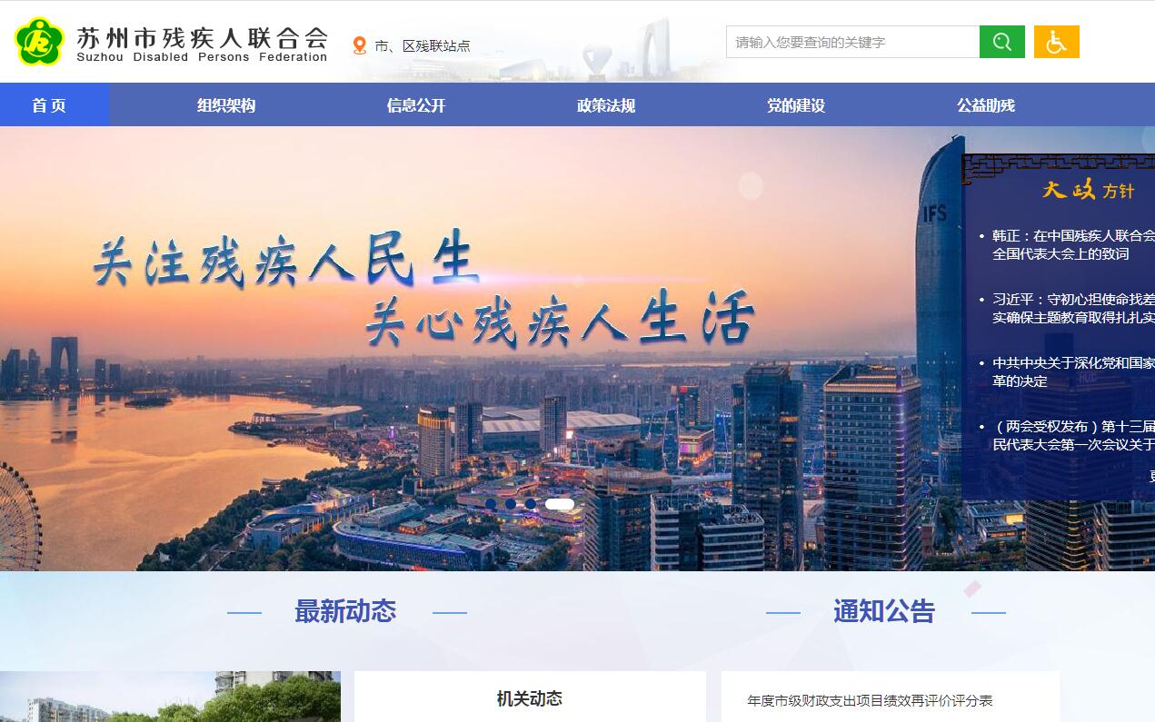苏州市残疾人联合会是中国残联的地方组织,是国家法律确认、政府批准的将残疾人自身代表组织、社会福利团体和事业管理机构融为一体的残疾人事业团体,具有“代表、服务、管理”职能:代表残疾人共同利益,维护残疾人合法权益;开展各项业务和活动,直接为残疾人服务;承担政府委托的部分行政职能,发展和管理残疾人事业。其主要职责是:(一)贯彻执行《中华人民共和国残疾人保障法》和国家、省、市有关残疾人工作的方针政策和法律法规:听取残疾人意见,反映残疾人需求,维护残疾人权益,为残疾人服务。(二)团结、教育残疾人遵守法律,履行应尽的义务,发扬乐观进取的精神,自尊、自信、自强、自立,为社会主义建设贡献力量。(三)弘扬人道主义,宣传残疾人事业,沟通政府、社会与残疾人之间的联系,动员社会理解、尊重、关心、帮助残疾人。(四)开展残疾人康复、教育、劳动就业、扶贫、福利、文化、体育、科研、用品供应、社会服务、无障碍设施建设和残疾预防工作,创造良好的环境和条件,扶助残疾人平等参与社会生活。(五)协助政府研究制定残疾人事业法规、政策、规划和计划,并组织实施和监督检查,指导和管理相关业务工作。(六)承担市政府残疾人工作协调委员会的日常工作,做好综合、组织、协调和服务工作。(七)负责苏州市残疾评定委员会的日常工作,开展残疾评定,发放和管理残疾人证,开展残疾人能力评估。(八)指导和管理本会下属单位和市直属各类残疾人社团组织。(九)负责全市残疾人工作领域的对外交流与合作。(十)承办市委、市政府交办的其他工作。