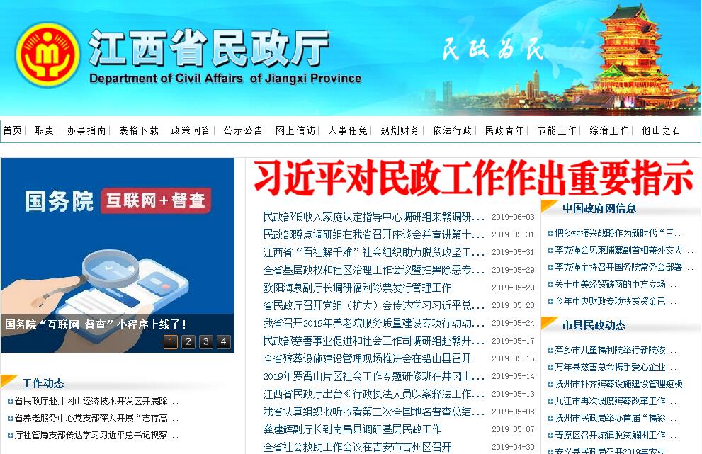 江西省民政厅主要职责:(一)在全省经济社会发展总体规划的框架内,拟订全省民政事业发展规划和政策,草拟有关地方性法规规章草案,并组织实施和监督检查。(二)承担依法对社会团体、基金会、民办非企业单位进行登记管理和监察责任。(三)拟订全省优抚政策,审批褒扬烈士,负责伤残的退役军人残级评定和伤残器械的配置,指导参战参试人员身份认定工作,组织和指导拥军优属工作,承担江西省拥军优属拥政爱民工作领导小组的有关具体工作。(四)会同有关部门拟订全省退役士兵、复员干部安置政策和计划并组织实施,指导军供站正规化建设和管理。(五)按规定做好全省军队离休退休干部、军队无军籍退休退职职工的接收安置和服务管理工作。(六)拟订全省救灾工作政策,负责组织、协调救灾工作,组织自然灾害救助应急体系建设,负责灾情的核查、统计、上报和发布工作,管理、分配救灾款物并监督使用,组织、指导救灾捐赠,承担江西省减灾委员会的具体工作。(七)牵头拟订全省社会救助规划、政策和标准,健全城乡社会救助体系,组织实施农村困难群众住房救助,负责城乡居民最低生活保障、医疗救助、临时救助、生活无着人员救助工作,负责城市低收入家庭收入核定的管理工作。(八)拟订全省城乡基层群众自治建设和社区建设政策,指导社区服务体系建设,提出加强和改进城乡基层政权建设的建议,推动基层民主政治建设。(九)拟订全省行政区划管理政策和行政区域界线、地名管理办法;负责设区市、县(市、区)、乡(镇)行政区域的设立、命名、变更和政府驻地迁移的审核工作;组织实施省县乡级行政区域界线的勘定和管理工作,负责重要自然地理实体命名、更名的审核。(十)拟订全省社会福利事业发展规划、政策、标准和社会福利机构管理办法,按职责负责福利彩票管理工作;组织拟订促进慈善事业的政策,组织、指导社会捐助工作;指导老年人、孤儿和残疾人等特殊群体权益保障工作。(十一)拟订全省婚姻管理、儿童收养和殡葬管理政策,负责推进婚俗和殡葬改革,指导婚姻、收养、殡葬、救助服务机构管理工作。(十二)会同有关部门按规定拟订全省社会工作发展规划、政策和职业规范,推进社会工作人才队伍建设和相关志愿者队伍建设。(十三)承办省人民政府交办的其他事项。