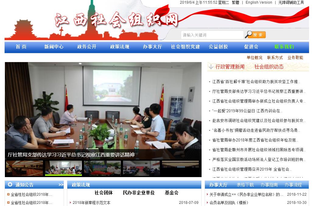 江西社会组织网由江西省社会组织管理局,江西省社会组织发展促进会主办。江西省社会组织管理局主要职责:拟订全省社会团体、基金会、民办非企业单位登记管理办法,并按照管辖权限进行登记管理和执法监察;承担社会组织信息管理工作;指导和监督设区市、县(市、区)对社会团体、基金会、民办非企业单位的登记管理工作。江西省社会组织发展促进会是由江西省民政厅核准登记的,由全省性社会团体、民办非企业单位、基金会自愿组成的联合性社会团体,是非营利性社会组织。本会的宗旨:高举中国特色社会主义伟大旗帜,以邓小平理论和“三个代表”重要思想为指导,深入贯彻落实科学发展观,坚持党的群众路线,遵守宪法、法律、法规和国家政策,提供服务、反映诉求、规范行为,提升社会组织建设质量。组织广大从事社会组织管理工作和有志于社会组织事业健康发展的同仁,共同探讨社会组织理论,提高社会组织的自律性、整体素质和业务水平,推进社会组织自我管理工作向法制化、民主化、科学化的方向发展,为建设和谐平安秀美江西做出应有的贡献。本会接受业务主管单位和社团登记管理机关--江西省民政厅的业务指导和监督管理。本会的业务范围:(一)宣传、贯彻国家有关社会组织培育发展和监督管理的方针政策、法律法规。(二)开展社会组织的调查研究,向政府反映有关情况和意见,为政府决策提供建议。(三) 研究做好政府事务性、技术性职能转移给社会组织的促进工作,探索政府与社会组织之间互动、互补和相互依存、相互促进的关系,充分发挥社会组织的桥梁和纽带作用。(四)开展学术交流、业务培训、咨询服务和会员联谊等多种活动。(五) 组织推进会员之间的合作与交流,搭建我省社会组织与国内、国际社会组织的交流与学习的平台。(六)引导会员建立和完善科学的法人治理结构,开展自律与诚信活动;(七)动员和组织开展社会公益活动,积极推动会员为经济社会发展服务;(八)编辑出版《江西社会组织》、管理“江西社会组织网”,宣传政府有关政策和社会组织管理、建设成果;(九)承办政府有关部门委托的其他事务。
