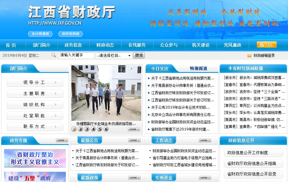 江西省财政厅是主管全省财政工作的省人民政府组成部门,其主要职责是:(一)贯彻执行国家的财政、税收法律法规和政策,拟订有关地方性法规规章草案。分析预测宏观经济形势,参与制定各项有关宏观经济政策,提出运用财税政策实施宏观调控和综合平衡社会财力的建议。研究财税发展战略,拟订省与市县、国家与企业的分配政策,完善鼓励公益事业发展的财税政策。(二)承担省本级各项财政收支管理的责任。负责编制年度省本级预决算草案并组织执行。受省政府委托,向省人民代表大会报告全省预算及其执行情况,向省人大常委会报告全省决算。组织制订经费开支标准、定额,负责审核批复部门(单位)的年度预决算。完善省对市县的转移支付制度。(三)负责政府非税收入管理。负责政府性基金管理,按规定管理行政事业性收费。管理财政票据。(四)组织制定国库管理制度和国库集中收付制度,指导和监督全省国库业务,按规定开展国库现金管理工作。负责制定政府采购制度并监督管理。(五)负责制定行政事业单位国有资产管理规章制度,按规定管理行政事业单位国有资产,制定需要全省统一规定的开支标准和支出政策,负责财政预算内行政机构、事业单位和社会团体的非贸易外汇管理。(六)负责审核和汇总编制全省国有资本经营预决算草案,制定国有资本经营预算的制度和办法,收取省本级企业国有资本收益,制定并组织执行企业财务制度,参与拟订企业国有资产管理相关制度,按规定管理资产评估工作。(七)负责办理和监督省本级财政的经济发展支出、省本级政府性投资项目的财政拨款,参与拟订省本级建设投资的有关政策,制定基本建设财务制度,负责有关政策性补贴和专项储备资金财政管理工作。(八)会同有关部门管理全省财政社会保障和就业及医疗卫生支出,会同有关部门拟订社会保障资金(基金)的财务管理制度,编制全省社会保障预决算草案。(九)参与研究利用外资的有关政策,管理外国政府和国际金融机构在江西贷款项目的有关业务。(十)负责管理全省的会计工作,监督和规范会计行为,指导和监督注册会计师和会计师事务所的业务,指导和管理社会审计。(十一)监督检查财税法规、政策的执行情况,反映财政收支管理中的重大问题。(十二)承办省人民政府交办的其他事项。