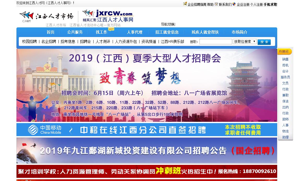 中国江西人才市场是由国家人事部与江西省人民政府共同组建的国家级区域性人才市场,是江西省人事厅直属的人才服务机构,是全省人才中介机构中功能全、业务广、环境优的人才市场。市场的目标是"立足江西,辐射全国,为各类人才提供满意的服务"。市场内设人才招聘部(高级人才部)、人才评荐部、代理派遣部、代理服务部、派遣服务部、人才信息部(人才人事网)、人才培训部、国际交流部、开发经营部、党委工作部、综合管理部等12个工作部门。江西人才人事网由江西省人力资源和社会保障厅(原江西省人事厅)主办,是中国江西人才市场的网上服务窗口,也是我省最成熟、最具影响力的专业人才网站。网站提供包括网站、报纸、电台、电视、社区媒介等多媒体全方位一体化发布途径,并与全省设区市人才市场联网,现拥有50余万人才简历,每日主页平均浏览量22万余次(网民访问流量居全省专业网站第一名),招聘单位会员52000余家。网站影响力覆盖全省,辐射华东、华南、华中,是中南地区重要的人才交流信息港之一。Jxrcw.com依托国家级人才市场中国江西人才市场,为人才供求双方提供多样化服务。为用人单位提供招聘信息发布,简历筛选、人才推荐、高级人才猎头、人事代理、人才测评、人才培训、人才派遣等优质HR解决方案,为求职者提供各类人才职业发展有关的丰富信息,包括最新职位、培训、职业指导信息以及其他个性化增值服务;与人才共同成长是我们的服务宗旨。人才信息量大、影响覆盖面广、招聘效果好、投入少回报多、人才匹配信息化是我们的服务特色,竭诚欢迎广大企事业单位来我站招聘人才!企业在我站招聘主要有会员服务和网络广告两种基本形式,其它的特色服务还有中高级人才猎头、人才培训等。