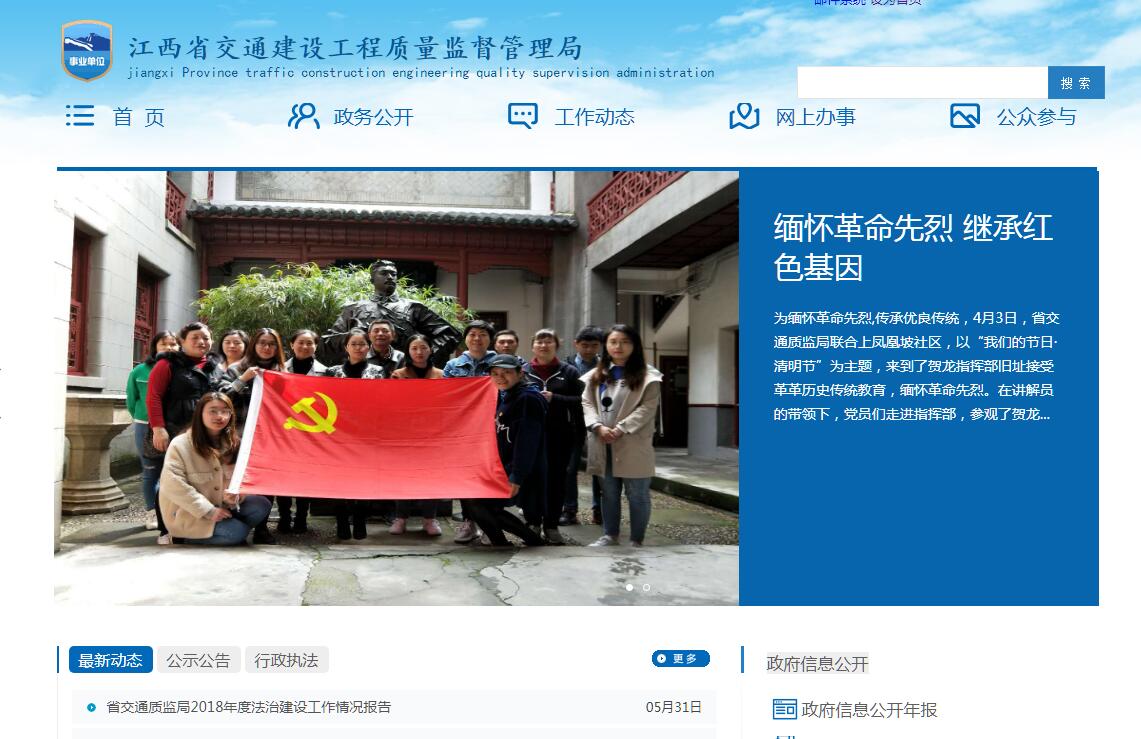 江西省交通建设工程质量监督管理局成立于1993年,原名“江西省交通工程质量监督站”,为江西省交通运输厅下属正处级全额拨款事业单位。主要职责是:负责全省重点公路水运新建工程、养护大修工程质量安全监督工作和普通国省干线公路质量安全综合督查工作以及监理、试验检测行业管理;指导设区市交通工程质监机构工作。局内设办公室、公路工程质量监督科、水运工程质量监督科、房建工程质量监督科、安全监督科、总工办、监理管理科、试验检测管理科、法规宣传科等9个科室,下设试验检测中心(公益二类事业单位)。多年来,质监局不断强化监督机制,落实监督责任,狠抓工程质量安全监督,积极培育和发展“热情服务,严格执法、照章办事、清正廉洁”的交通质监行业文化,物质和精神文明建设均取得了丰硕成果,为我省交通建设又好又快提供了质监保障。04年被交通部授予“全国先进交通工程质量监督站”荣誉称号,连续多年保持“江西省文明单位”、“江西省直机关文明单位”、“南昌市文明单位”等荣誉称号。局试验检测中心通过国家实验室认可,成为全国交通系统第八家通过国家实验室认可的权威检测机构。所参与的《高速公路填沙路基关键技术研究与应用》等多个课题获江西省科学技术进步奖。