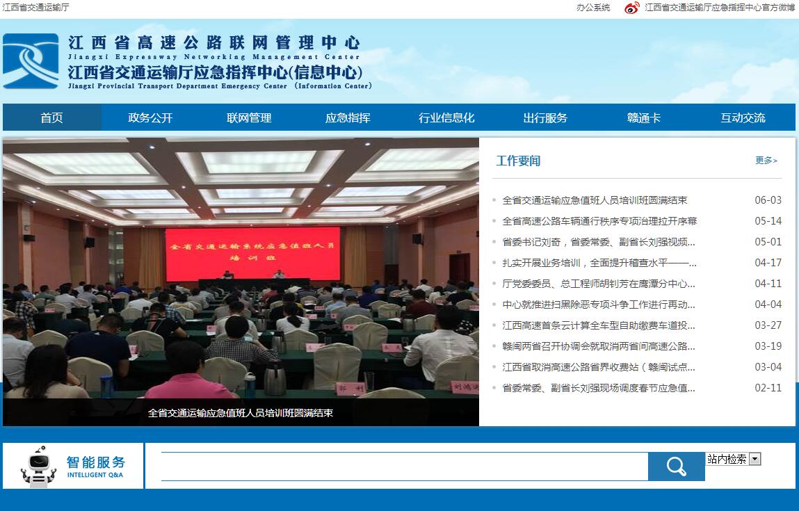 2016年5月,经厅党委研究决定,江西省高速公路联网管理中心与江西省交通运输厅应急指挥中心(信息中心)合署办公,中心领导交叉任职,统筹推进各项工作。江西省高速公路联网管理中心(以下简称“中心”)成立于2002年5月,为省交通运输厅直属正处级自收自支事业单位。中心内设六个部门(综合科、技术设备科、收费结算科、通信监控科、稽查科、客服科),下设11个分中心,分布在全省11个设区市。全中心共有干部职工180余人,其中本科以上学历人员占93%,硕士以上占58%;中级以上职称占80%,副高以上职称占35%。截至2016年12月底,江西省高速公路通车总里程达到6000公里,全部实现了路通网通、联网管理。受省交通运输厅委托,主要落实如下职能:(一)宣传、贯彻国家和省有关高速公路联网的政策、法规,参与编制全省高速公路联网系统的发展规划,负责制定全省高速公路联网系统技术标准和有关规定、办法及规范;(二)负责全省高速公路联网管理工作,指导和协调有关各方联网事务;(三)负责全省高速公路通信系统骨干网和收费系统的建设与管理,指导全省高速公路通信系统接入网和监控系统的建设;(四)负责全省高速公路联网三大系统的运行和维护;(五)负责对全省高速公路交通工程机电项目建设进行技术指导;(六)负责全省高速公路联网稽查工作;(七)负责全省赣通卡客户服务体系的建设与运行管理;负责全省高速公路卡票的制作和管理;(八)负责全省高速公路联网信息采集、汇总;(九)组织联网收费、通信、监控、客服等相关人员的业务培训;(十)承担省交通运输厅交办的其他工作。江西省交通厅信息中心(以下简称“中心”)成立于1996年6月24日,为省交通运输厅直属正处级自收自支事业单位。2010年,省编办批复在江西省交通厅信息中心的基础上组建江西省交通运输厅应急指挥中心,增挂江西省交通运输厅信息中心的牌子,单位为正处级自收自支事业单位。从事交通应急救援信息技术服务、软硬件系统的开发、建设、应用、维护、推广,信息化项目建设、信息系统咨询、交通运输信息服务、技术培训等服务。中心现有干部职工50人,硕士研究生以上学历的为4人,大学本科以上学历31人,专业技术型人员总计为45人,占我中心全体人员数量的90%。2011年5月,中心的“智慧创新交通”团队被评为省厅六大科技创新团队之一。受省交通运输厅委托,主要落实如下职能:(一)承担全省交通运输行业运行状况的监测监控、应急处置的技术支撑和信息保障,应急指挥中心信息系统的日常维护和管理;负责协调全省公路、水路应急救援工作,全省交通运输行业信息的收集、整合、分析、交换与发布。(二)拟订全省交通运输信息化发展政策、发展规划、工可与技术规范,协助省厅做好全厅信息化建设项目和系统的论证、审批、审查、验收、评估、考核等技术管理工作。(三)承担省厅综合性和全局性信息化平台、厅本级信息化系统的建设、维护与管理。(四)负责省厅门户网站、OA办公系统、业务应用系统、网络信息安全相关的软、硬件系统的维护管理。(五)负责全厅信息化资源的统筹、整合和协调,信息化工程资产的登记管理工作。(六)承担全省公路、水路智能交通系统建设的指导与协调。(七)开展交通运输行业信息化技术的研究与应用、指导与服务、咨询与培训工作。(八)承办省厅交办的其他工作。