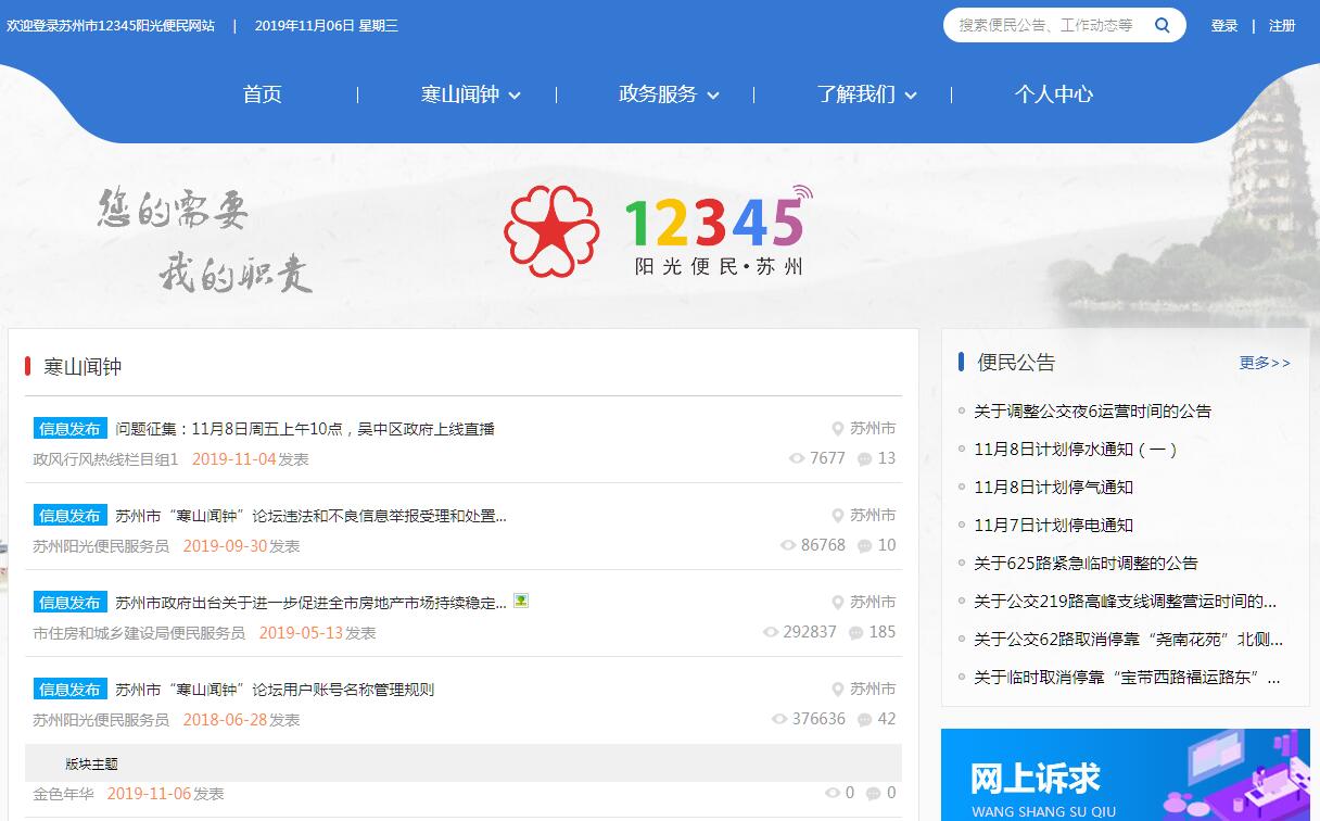 2004年5月18日,苏州市人民政府第29次常务会议决定,建立“苏州市便民服务中心”,旨在通过整合政府部门和有关行业单位的公共服务资源,设立统一的服务热线平台,365天×24小时为市民提供方便、快捷、优质、规范的服务。苏州市便民服务中心暨“12345”服务热线于2005年4月19日试运行,2005年12月26日正式挂牌。市便民服务中心为市行政审批局下属、副处级、公益一类事业单位。其主要职责是:一是负责拟订全市便民服务工作的标准、规范,并组织实施;二是负责市“12345”政府公共服务热线的运行管理,承担与其他市级公共服务热线和服务平台的对接、联动、合作;三是负责市“12345”政府公共服务热线的诉求受理、答复,事项的交办、跟踪、督办和回复回访,协助做好承办单位的业务协调、服务质量和服务效果的监督考核工作;四是依托“12345”服务平台,开展社情民意调研、舆情分析,向公众提供相关的政务信息服务;五是参与文明创建、社会信用、城市管理、城市综合服务标准化、政风行风、作风效能、绩效管理等公共事项的管理;六是参与防汛防旱、防台风、突发水污染、突发固体废物污染、食品安全等突发事件的应急管理;七是指导各市、区便民服务业务工作。