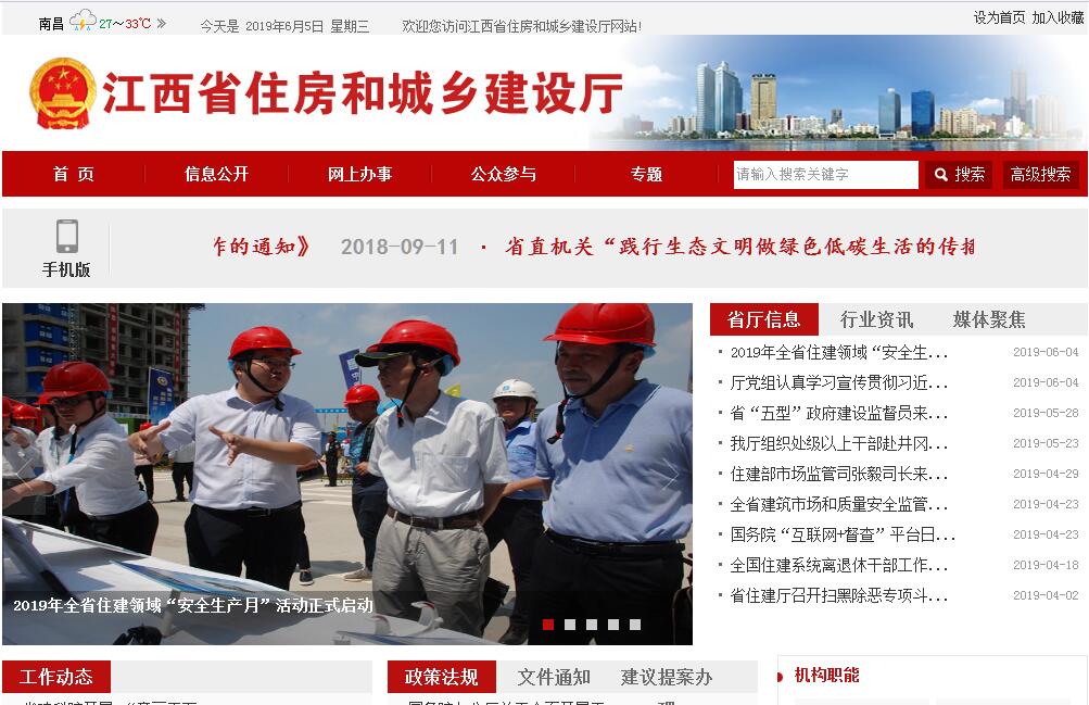 江西省住房和城乡建设厅主要职责:(一)承担保障全省城镇低收入家庭住房的责任。拟订住房保障相关政策并指导实施。在全省经济社会发展总体规划的框架内,拟订廉租住房规划及政策,会同有关部门做好全省有关廉租住房资金安排,监督市、县组织实施。编制住房保障发展规划和年度计划并监督实施。(二)承担推进全省住房制度改革的责任。拟订适合省情的住房政策,指导住房建设和住房制度改革,拟订全省住房建设规划并指导实施,研究提出住房和城乡建设重大问题的政策建议。(三)承担规范全省住房和城乡建设管理秩序的责任。起草住房和城乡建设的地方性法规规章草案。依法组织编制和实施城乡规划,拟订城乡规划的政策和规章制度,会同有关部门组织编制全省城镇体系规划,负责省人民政府交办的城市总体规划、市域城镇体系规划的审查报批和监督实施,参与土地利用总体规划纲要的审查,拟订住房和城乡建设的科技发展规划和经济政策。(四)承担建立全省科学规范的工程建设标准体系的责任。组织制定工程建设实施阶段的地方标准,组织实施工程建设统一定额和行业标准,拟订建设项目可行性研究评价方法、经济参数、建设标准和工程造价的管理制度,拟订公共服务设施(不含通信设施)建设标准并监督执行,指导监督各类工程建设标准定额的实施和工程造价计价,组织发布工程造价信息。(五)承担规范全省房地产市场秩序、监督管理房地产市场的责任。会同或配合有关部门组织拟订房地产市场监管政策并监督执行,指导城镇土地使用权有偿转让和开发利用工作,提出房地产业的行业发展规划和产业政策,制定房地产开发、房屋权属管理、房屋租赁、房屋面积管理、房地产估价与经纪管理、物业管理、房屋征收拆迁的规章制度并监督执行。(六)监督管理全省建筑市场,规范市场各方主体行为。指导全省建筑活动,组织实施房屋和市政工程项目招投标活动的监督执法,拟订勘察设计、施工、建设监理的地方性法规、规章并监督和指导实施,拟订工程建设、建筑业、勘察设计的行业发展战略、中长期规划、改革方案、产业政策、规章制度并监督执行,拟订规范建筑市场各方主体行为的规章制度并监督执行,组织协调建筑企业参与国际工程承包、建筑劳务合作。(七)研究拟订全省城市建设的政策、规划并指导实施,指导城市市政公用设施建设、安全和应急管理,拟订全省风景名胜区的发展规划、政策并指导实施,负责省级以上风景名胜区的审查报批和监督管理,组织审核世界自然遗产的申报,会同文物等有关主管部门审核世界自然与文化双重遗产的申报,会同文物主管部门负责历史文化名城(镇、村)的申报、保护和监督管理工作。(八)承担指导规范全省村镇建设的责任。拟订村庄和小城镇建设政策并指导实施,指导村镇规划的编制、农村住房建设和安全及危房改造,指导小城镇和村庄人居生态环境的改善工作,指导全省重点镇建设。(九)承担全省建筑工程质量安全监管的责任。拟订建筑工程质量、建筑安全生产和竣工验收备案的政策、规章制度并监督执行,组织或参与工程重大质量、安全事故的调查处理,拟订建筑业、工程勘察设计咨询业的技术政策并指导实施。(十)承担推进全省建筑节能、城镇减排的责任。会同有关部门拟订建筑节能的政策、规划并监督实施,组织实施重大建筑节能项目,推进城镇减排。(十一)负责全省住房公积金监督管理,确保公积金的有效使用和安全。会同有关部门拟订住房公积金政策、发展规划并组织实施,制定住房公积金缴存、使用、管理和监督制度,监督全省住房公积金和其他住房资金的管理、使用和安全,管理住房公积金信息系统。(十二)承办省人民政府交办的其他事项。