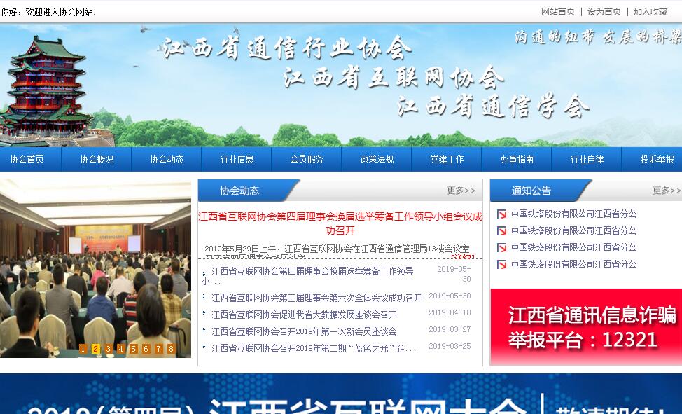 江西省互联网协会成立于2001年10月15日,由我省从事互联网行业的通信运营商、信息服务提供商、通信设备制造商、系统集成商以及科教文卫机构等数十家互联网从业者共同发起成立,是由我省互联网行业及与互联网相关的企事业单位自愿结成的全省性、行业性、非营利性的社会团体组织。协会的业务主管单位是江西省通信管理局,协会办公地址设在南昌市红谷滩区赣江南大道2698号。协会会员包括我省互联网行业从业单位、互联网相关产业的企事业单位、社会团体,以及关心和有志于推动中国互联网事业发展的企事业单位、社会团体等。本协会的宗旨是:遵守国家宪法、法律和法规,遵守社会道德风尚;坚持以创新思维、协作文化、开放平台,有效服务的指导思想,为会员需要服务,为行业发展服务,为政府决策服务。协会的基本任务是:(一)团结互联网行业相关企业、事业单位和社会团体,向政府主管部门反映会员和业界的愿望及合理要求,向会员宣传国家相关政策、法律、法规。(二)制订并实施互联网行业规范和自律公约,协调会员之间的关系,促进会员之间的沟通与协作,充分发挥行业自律作用,维护国家信息安全,维护行业整体利益和用户利益,促进行业服务质量的提高。(三)开展我国互联网行业发展状况的调查与研究工作,促进互联网的发展和普及应用,向政府有关部门提出行业发展的政策建议。(四)组织开展有益于互联网发展的研讨、论坛等活动,促进互联网行业内的交流与合作,发挥互联网对我国社会、经济、文化发展的积极作用。(五)积极开展国际交流与合作,组织国内互联网相关企事业单位参与国际互联网有关组织的活动,在国际互联网事务中发挥积极作用。(六)办好协会网站、刊物,组织编撰出版江西省互联网发展状况年度报告,为业界提供互联网信息服务。(七)承担会员单位或政府有关部门委托的其他事项。
