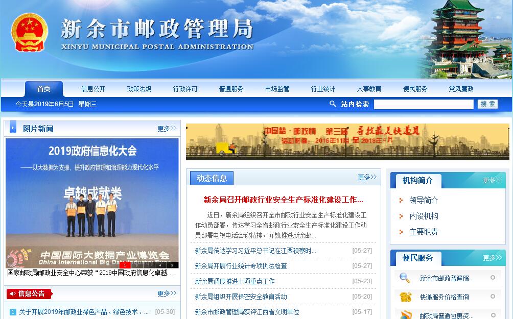 | 网站简介: 根据国务院办公厅、中央编办和江西省人民政府关于完善省级以下邮政监管体制的文件规定,新余市邮政管理局设置成立并于2012年11月16日挂牌运行。机构规格比照同级政府部门管理机构确定,实行中央和地方双重管理、以中央为主的管理体制,对邮政、快递企业履行监管责任,邮政管理工作纳入地方政府工作考核体系。其主要职责是:在上级邮政管理部门和地方党委、政府的领导下,贯彻执行国家邮政法律法规、方针政策和邮政服务标准;研究拟订本地区邮政发展规划;监督管理本地区邮政市场以及邮政普遍服务和机要通信等特殊服务的实施;负责行业安全生产监管、统计等工作;保障邮政通信与信息安全;承办上级邮政管理部门及地方人民政府交办的其他事项。 |
