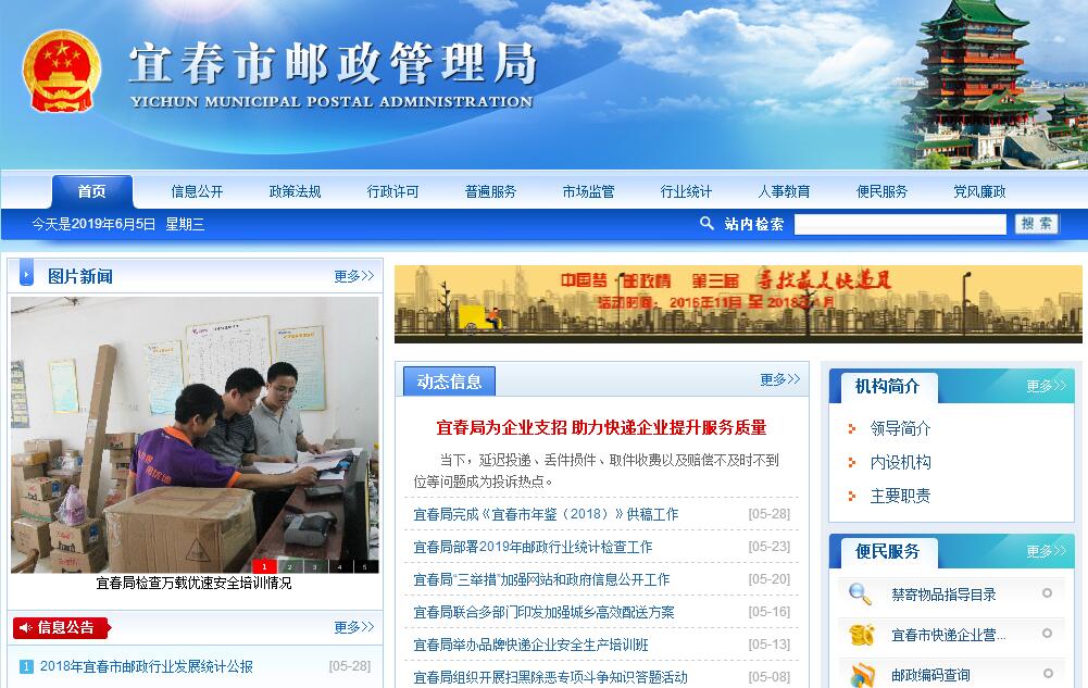 | 网站简介: 宜春市邮政管理局是根据《关于完善省级以下邮政监管体制的通知》(国办发[2012]6号)精神,于2012年11月19日成立,实行中央和地方双重管理、以中央为主的管理体制,机构规格比照同级政府部门管理机构确定。行政编制11人,为中央垂直管理系统编制。内设办公室、普遍服务科、市场监管科3个科室。其主要职责是:在国家邮政局、省邮政管理局的领导下,贯彻执行国家邮政法律法规、方针政策和邮政服务标准,研究拟定本地区邮政发展规划,监督管理本地区邮政市场以及邮政普遍服务和机要通信等特殊服务的实施,负责行业安全生产监管、统计等工作,保障邮政通信与信息安全,承办上级邮政管理部门和地方政府交办的其他事项。 |