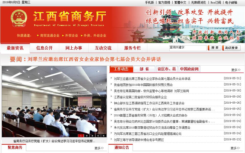 江西省商务厅主要职责:(一)贯彻执行国家关于国内外贸易、国际经济合作、利用外资和口岸工作的法律、法规和方针、政策,起草我省国内外贸易、国际经济合作、利用外资和口岸管理的地方性法规、规章草案和政策,并组织实施有关法规、规章和政策。(二)在全省经济和社会发展总体规划的框架内,拟订全省国内外贸易、国际经济合作和口岸开放的发展战略及规划,并组织实施。(三)拟订年度商务运行调控目标和措施并组织实施,统计、分析和发布重要商务信息,参与协调商务运行中涉及财政、金融、税务、统计等领域的政策问题。(四)负责推进流通产业结构调整,指导流通企业改革和社区商业发展,负责商贸服务业行业管理,提出促进商贸中小企业发展的政策建议,推动流通标准化和连锁经营、商业特许经营、物流配送、电子商务等现代流通方式的发展。(五)承担牵头协调整顿和规范我省市场经济秩序工作的责任,参与组织打击商务领域侵犯知识产权、商业欺诈等工作,推动商务领域信用建设,指导商业信用销售,建立市场诚信公共服务平台,对特殊流通行业进行监督管理。(六)促进城乡市场发展,指导大宗商品批发市场规划和城市商业网点规划、商业体系建设的工作,推进农村市场体系建设,组织实施农村现代流通网络工程。(七)承担组织实施重要消费品市场调控和重要生产资料流通管理的责任,负责建立健全生活必需品市场供应应急管理机制,监测分析市场运行、商品供求状况,调查分析商品价格信息,进行预测预警和信息引导,按分工负责重要商品储备管理和市场调控工作,负责生猪屠宰、酒类专卖相关管理工作,按有关规定对成品油流通进行监督管理。(八)促进贸易增长方式转变,指导和协调贸易促进体系的建立,负责推动企业开拓多元化国际市场,执行国家进出口商品、加工贸易管理办法和进出口管理商品、技术目录,负责组织实施重要工业品、原材料和重要农产品进出口总量计划工作,负责管理机电产品进出口工作,指导和协调加工贸易工作,负责出口加工区的指导协调和审核、报批等工作。(九)执行国家对外技术贸易、出口管制以及鼓励技术和成套设备进出口的政策,推进进出口贸易标准化工作,依法监督技术引进、设备进口、国家限制出口技术的工作,依法颁发防扩散等与国家安全相关的进出口许可证件。(十)牵头拟订服务贸易发展规划并开展相关工作,会同有关部门制定我省促进服务出口和服务外包发展的规划、政策并组织实施,推动服务外包平台建设。(十一)负责涉及世贸组织规则的相关工作, 承担组织协调反倾销、反补贴、保障措施及其他与进出口公平贸易相关工作的责任,建立进出口公平贸易预警机制,组织产业损害调查,指导协调产业安全应对工作及国外对我省出口商品的反倾销、反补贴、保障措施的应诉相关工作。(十二)负责利用外资和引进省外资金工作,组织拟订优化投资环境的措施,负责重大招商活动的组织协调和重大引资项目的协调推进工作,依法核准外商投资项目的合同章程和法律特别规定的重大变更事项,依法监督检查外商投资企业执行有关法律、法规、规章和合同章程的情况并协助解决有关问题,指导省内国家级经济技术开发区的有关工作,为来赣投资者及在赣投资企业提供政策咨询和协调服务工作。(十三)参与区域经济合作的组织协调工作,负责外省驻赣商会、驻赣办事机构、赣商联合会和我省驻外商会、驻外办事机构的相关协调服务工作,指导省政府驻外机构引进资金和经济协作业务工作,负责对口支援的组织实施工作。(十四)负责对外经济合作工作,依法核准、推进省内企业在境外投资开办企业(金融企业除外),指导和推进对外工程承包、外派劳务合作和境外就业等,负责牵头外派劳务和境外就业人员的权益保护工作,负责归口管理对外援助、接受国际多双边无偿援助及赠款,负责有关国际组织与我省经济技术合作交流事务。(十五)负责口岸管理、口岸物流、电子口岸的规划建设工作,负责开辟国内、国际航线、航班及陆路、水路口岸通道的协调工作,负责推动“大通关”建设,协调口岸基础设施的建设,指导、推进口岸作业区建设并组织验收,组织口岸集疏运工作,协调口岸通关中各有关方面的工作。(十六)承办省人民政府交办的其他事项。