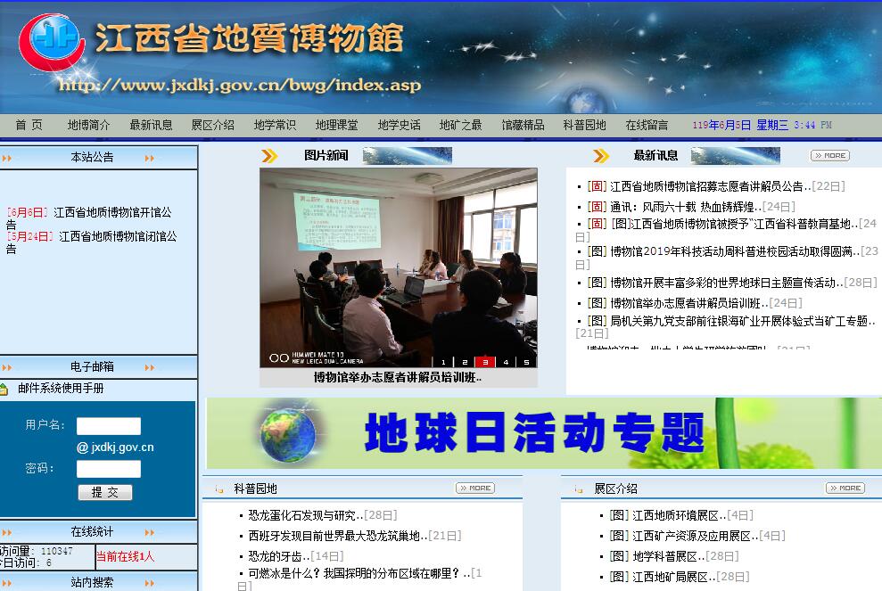 江西省地质博物馆已有九十多年的建馆历史,其前身是1927年江西矿业调查所设立的“江西地质矿产标本室”和1935年李四光教授创立的“庐山地质馆”。 两馆1939年迁到泰和县以后,更名为“地质陈列馆” ,战争期间又几经搬迁,原标本已散失贻尽。解放后,党和国家高度重视地质工作,江西省地质局1958年建局后,于1962年设立了“江西地质岩矿标本陈列室”,陈列室在文革期间被毁。1982年,江西省地质局又将一栋两层楼的老办公楼用于筹建“江西地质展览馆”,该馆于1987年更名为“江西地质博物馆”。2003年江西省地矿局决定在原博物馆的位置新建办公楼,并将新办公楼二楼作为博物馆的新馆址,于2004年1月拨专款对“江西地质博物馆”重新进行规划设计布展。2006年1月,新馆建成之际省编委批准成立 “江西省地质博物馆”,同年2月27日正式开馆。10多年来,因博物馆展柜出现破损、设施逐渐老化、布局相对陈旧,影响了博物馆的参观效果,2016年底,局决定拨专款进行重新布展。2018年5月,在江西省地矿局建局60周年之际,重新布展的江西省地质博物馆如期完工。新馆设计新颖美观、布局自然独特、陈列内容丰富,设有“地学科普”、“江西地质”、“地矿局史”三个展区,重点陈列了形式多样的文图展板、丰富多彩的地质标本、内容翔实的物件史料,配以视频放映、多媒体查询、场景再现、声光电等设施,充分展示了江西大地近20亿年的历史变迁、丰富的矿产资源和江西地矿局成立60年的辉煌历程。博物馆自开馆以来,一直致力于开展地学科普教育,积极参加“世界地球日”、“科技活动周”、“全国科普日”、“青少年地学夏令营”等重大地学科普活动及其它相关科普宣传教育活动,先后接待了数十位省、部级领导和有关政府及企事业单位的参观团队,接待了各省市地矿单位的领导和专家团队,接待了数十个国家和地区的政府官员及矿业投资合作访问团,接待了省委党校、省直工委党校的多批学员,并通过接待来馆参观及进校园、进社区、进矿山等方式,面向数万名广大社会公众及大、中、小学生普及地球科普知识,在省内外同行中享有较高知名度,受到社会各界人士的一致好评。先后获得“中国地质博物馆江西分馆”、 “国土资源科普基地”、“全国科普教育基地”、“江西省科普教育基地”、“江西省青少年科技教育基地”等荣誉。