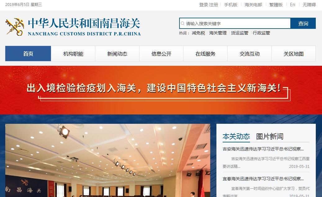 中华人民共和国南昌海关(简称南昌海关)是由中华人民共和国海关总署直接领导的正厅级直属海关。其前身为1980年成立的九江海关(直属海关总署的正处级机构)。1987年10月4日,国务院批复同意设立南昌海关(副厅级),1988年12月1月正式开关。2004年1月18日,南昌海关由副厅级升格为正厅级。南昌海关管辖范围为江西省全境。主要职责包括:依法对本关区内进出境的货物、运输工具、行李邮递物品等进行监管;征收关税和其他法定由海关征收的税费;出入境检验检疫;查缉走私;开展贸易统计并办理其他海关业务等。2018年,南昌海关坚持以习近平新时代中国特色社会主义思想为指导,认真落实海关总署“坚持马上就办、真抓实干,扎实推进政治建关、改革强关、依法把关、科技兴关、从严治关”的总体要求,绝对忠诚讲政治,把好国门强基础,改革创新抓落实,严管厚爱带队伍,快干实干会干,关区各项工作稳中有进、稳中向好。十三届全国人大一次会议审议通过的《国务院机构改革方案》明确“原国家质量监督检验检疫总局的出入境检验检疫管理职责和队伍划入海关总署”,目前转隶组建正式完成,机构职能、组织机构相关信息待新“三定”方案落地后更新。