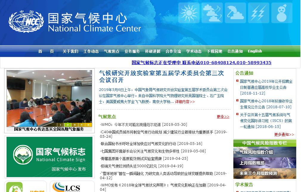 1994年2月,国务院批准组建国家气候中心。1995年1月,国家气候中心挂牌成立,隶属于中国气象局,为独立的司局级法人事业单位,是国家级科技型业务单位,同时也是中国气象局气候变化中心、世界气象组织亚洲区域气候中心、东亚季风活动中心、亚洲极端天气气候事件监测评估中心和全球长期预报产品中心。国家气候中心承担着国家级气候和气候变化监测、预测、影响评估业务、服务和科研任务,坚持面向国家需求和国际科技前沿,为气象防灾减灾、应对气候变化和生态文明建设提供全方位、多层次、精细化的高质量服务。国家气候中心设置有12个部门:办公室、业务科技处(北京气候中心秘书处)、计划财务处、人事教育处(离退休干部办公室)、党委办公室(监察审计室)5个职能处室,以及气候服务室(决策服务中心气候服务室)、气候预测室(东亚季风活动中心、全球长期预报产品中心)、气象灾害风险管理室(气候灾害监测预警中心)、气候变化室(气候变化中心办公室)、气候模式室、气候研究开放实验室、业务系统发展与运控室7个科研业务处室,另外还设有博士后科研工作站。国家气候中心编制人数200人,拥有一支较高水平的气候和气候变化研究队伍,其中中国科学院院士1人、中国工程院院士1人,国家级首席专家8人,973首席科学家3人,研究员(正研级高工)45人,副研究员(高级工程师)86人。国家气候中心有博士生导师11人,硕士生导师13人。另外有一批国内外特聘专家、访问学者、交流预报员在中心开展合作研究。承担组织过国家和部门重大科研项目,取得了较好研究成果,一些研究成果应用于气候和气候变化业务取得了明显的社会和经济效益。成功地预测了1998年长江流域的严重洪涝灾害、2015年汛期我国降水“南多北少”分布格局等。成功地监测预测了1997/1998年、2002/2003年、2004/2005年、2006/2007年、2009/2010年、2014-2016年等厄尔尼诺事件。每年为党和政府各级部门提供数百份气候和气候变化决策服务材料。为三峡工程、青藏铁路工程和南水北调工程等重大工程及时提供了气候背景分析、气候趋势预测和未来区域气候变化情景预估等决策服务材料。目前,国家气候中心已经建设成为一个集气候系统监测诊断分析、气候预测、气候影响评估、灾害风险管理、气候变化研究和气候服务为一体的科研业务相结合的国家级气候业务科研中心。建成了一整套适用于中国和东亚气候特点的短期气候监测、预测、评价业务系统;建立了由全球大气环流模式、海洋环流模式、海-气耦合模式、东亚区域气候模式、高分辨率太平洋-印度洋模式、ENSO预测模式等组成的动力气候模式业务系统。初步具备了世界气象组织区域气候中心要求具备的功能和能力。能向中国各级政府和世界气象组织成员国提供气候和气候变化业务产品有几十余种。未来将建设成为亚洲区域气候科研计划的协调中心和科研业务培训中心。实现国家级气候业教研资源的最优化使用和共享,提供我国、亚洲乃至世界的气候系统监测、预测、影响评估以及预估产品,为我国和世界其它国家适应未来气候变化制定适应对策。