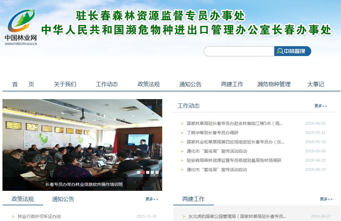 国家林业和草原局驻长春森林资源监督专员办事处成立于1989年,是国家林业局第一批派驻国有林区的森林资源监督机构。核定编制27人,内设综合处、资源监管处、林政监管处、专项业务监管处和濒危物种进出口管理处5个处室,现有干部26人。我办全称是“国家林业局驻长春森林资源监督专员办事处”和“中华人民共和国濒危物种进出口管理办公室长春办事处”,两块牌子,一套人马。其主要职责是:1.监督有关森林资源的政策、法规执行情况;监督检查森林采伐限额的编制与年度木材生产计划执行情况;监督检查伐区拨交和验收制度的执行情况;监督森林资源档案管理;审核各国有森工企业局伐区申请,核发林木采伐许可证,核查伐区调查设计、作业质量。2.监督林权、林地管理的政策、法规的执行情况;监督木材运输证制度的执行情况;监督木材检查站等基层林业行政执法单位依法管理情况;现地审核占用征收国有森工企业林地的申请;对占用征收林地、占用征收林地行政许可被许可人实施监督检查;依法对林政案件进行检查和督办。3.对县级人民政府保护发展森林资源目标责任制实施监督检查;负责对林业专项资金、湿地保护、野生动植物保护、森林公园和自然保护区建设、森林防火、防沙治沙等开展专项检查。4.负责监督和指导野生动植物进出口管理工作;登记备案有野生动植物进出口权的单位;查验核发野生动植物或其产品的《进出口证明书》,查验核发非《进出口野生动植物种商品目录》物种证明;收取野生动植物或其产品进出口管理费;负责对濒危物种的进出口案件及违法行为进行查处;对被没收物种的救护和安置、进出口活体野生动植物的装运进行核查和管理;开展《中华人民共和国濒危野生动植物进出口管理条例》、《濒危野生动植物种国际贸易公约》及有关法律法规的宣传教育和培训。