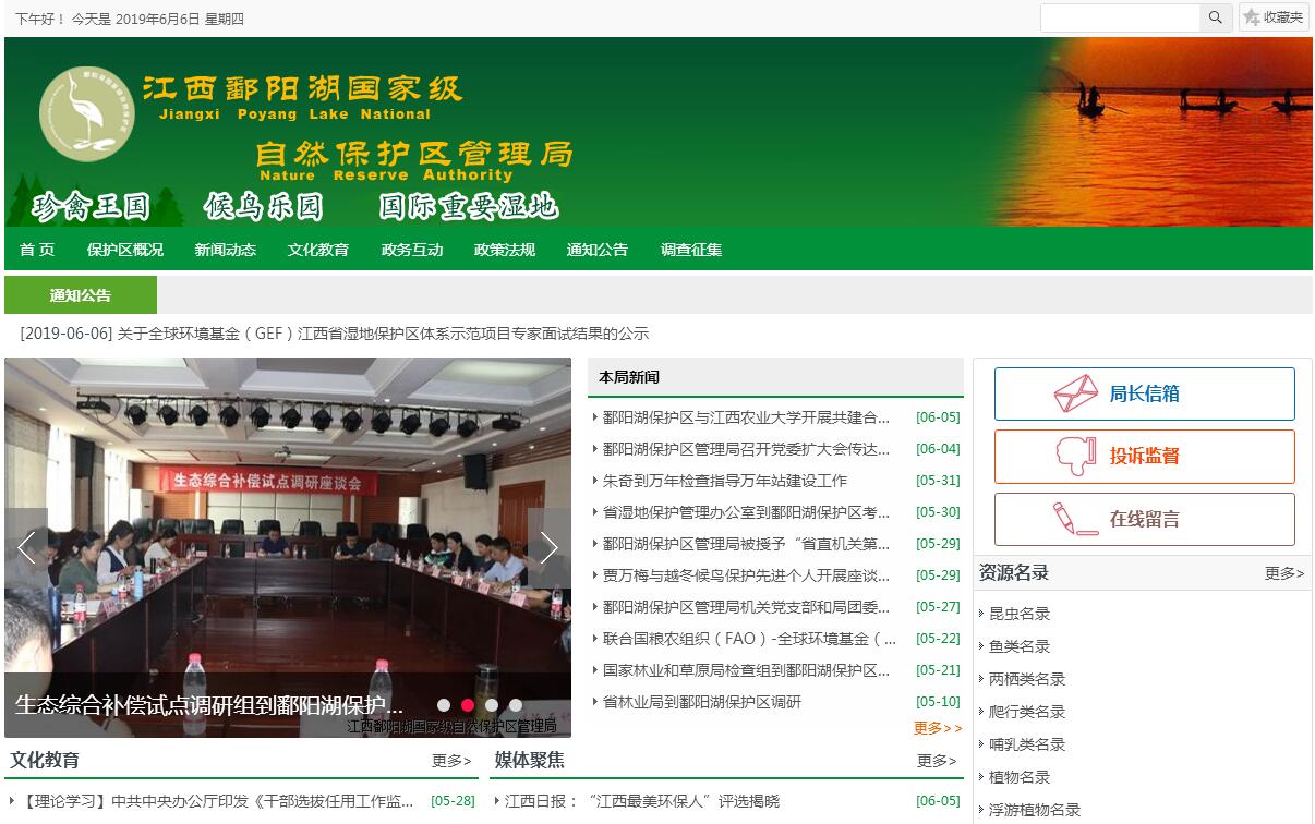 江西鄱阳湖国家级自然保护区成立于1983年,原名为“江西省鄱阳湖候鸟保护区”,1988年晋升为国家级,并更名为“江西鄱阳湖国家级自然保护区”,主要职能是保护鄱阳湖以白鹤为代表的珍稀候鸟和湿地生态环境,开展与生态保护相关的科学研究,科学地、可持续地利用自然资源。鄱阳湖保护区隶属于江西省林业厅,为正处级全额拨款事业单位,2011年列入参公管理。保护区现有编制100名,在编95人。管理局内设办公室、人事科、科研管理科、资源管护科、财务科、项目管理科、宣传教育科、社区事务科8个职能科室,吴城、大湖池、沙湖、大汊湖4个保护管理站以及进贤、余干、鄱阳、都昌、湖口、九江、万年(建设中)7个保护监测站。鄱阳湖大而神奇, 为国际重要湿地。当水位22.59m(为1998年湖口水文站实测历年最高洪水位,吴淞高程系统)时,湖面面积约为4500km2;2011年干旱时水面面积缩减至1326km2(湖口站水位9.74m),创下有卫星监测记录以来最小水面。鄱阳湖湖岸线长1200 km,有74个滨湖乡(镇、场),沿湖118万人口。保护区位于鄱阳湖的西北角,地跨新建县、永修县和庐山市,管辖有沙湖、大汊湖、蚌湖、朱市湖、梅西湖、象湖、大湖池、常湖池、中湖池九个湖泊,总面积为224km²,现在正向全湖管理迈进,让保护的红旗插遍整个鄱阳湖。其中大湖池、沙湖归保护区所有,另外租赁了朱市湖、象湖和常湖池三个湖泊20年的使用和管理权。保护区内湿地生态系统结构完整,生物资源丰富。据统计,有鸟类381种、贝类40种、兽类45种、浮游动物46种、爬行类48种、浮游植物50种、鱼类136种、昆虫类227种、高等植物476种。国家Ⅰ级重点保护鸟类有10种,分别是黑鹳、中华秋沙鸭、白尾海雕、白肩雕、金雕、白鹤、白头鹤、大鸨和遗鸥,国家Ⅱ级重点保护鸟类56种,如小天鹅、白额雁、白琵鹭、日本松雀鹰及白枕鹤等,江西省重点保护鸟类85种,如鸿雁、斑嘴鸭和绿头鸭等;中国特有鸟类4种,分别是灰胸竹鸡、宝兴歌鸫、棕噪鹛和黄腹山雀;世界自然保护联盟濒危物种红色名录(IUCN红色名录)受胁物种23种,包括极危物种2种,即青头潜鸭和白鹤,濒危物种5种,分别是东方白鹳、黑脸琵鹭、红胸黑雁、中华秋沙鸭和黄胸鹀,易危物种16种,如鸿雁、白枕鹤和白头鹤等。属于中日候鸟保护协定中保护的鸟类有168种,占该协定中保护鸟类总数的74.3%;属于中澳候鸟保护协定中保护的鸟类有48种,占该协定中保护鸟类总数的59.3%。每年到鄱阳湖越冬的候鸟数量多达60-70万只。越冬白鹤最高数量达4000余只,占全球98%以上。全世界80%以上的东方白鹳、70%以上的白枕鹤在鄱阳湖保护区内越冬。这里是世界上最大的鸿雁种群越冬地(数量达6万多只),也是中国最大的小天鹅种群越冬地(最高数量达9万多只),同时也是大量珍稀候鸟的重要迁徙通道和停歇地,有10余种南北半球间迁徙的鸻鹬类在鄱阳湖补充食物,其数量也达到了全球数量的1%以上,是候鸟迁徙的重要位点。保护区四季分明,景色怡人,是著名的旅游胜地。春天的鄱阳湖滩涂碧绿,是一片广袤无垠的大草原,有高高的南荻和芦苇,也有低矮成片的苔草和美丽的紫云英(红花草);夏天的鄱阳湖烟波浩渺水连天,是一汪无边无际的海洋,民间誉为“鄱阳湖海”;秋天的鄱阳湖硕果累累,稻浪滚滚鱼满仓,是一派丰收的景象;冬天的鄱阳湖枯水一线,滩涂尽显,看似荒凉,实则热闹非凡,数几十万越冬候鸟在此栖息,是一个充满生机的候鸟天堂。