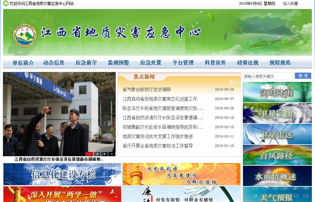 江西省地质灾害应急中心成立于2010年11月12日,是江西省地质灾害应急指挥部下属专业应急机构,是保障江西省国土资源厅履行地质灾害防治职责的技术支撑,是由江西省国土资源厅管理的直属事业单位。其职责是负责全省重大地质灾害应急技术处置和应急平台管理工作,按要求承担地质灾害调查、监测预警、巡查排查、宣传培训、防治工程监管等地质灾害应急工作和防治工作,正处级全额拨款事业单位。是公益性地质环境专业技术单位。[1] 内设综合科、应急科、监测预警科、信息科、防治项目管理科、井冈山地质灾害防治工作站(兼宜春温汤地热监测站)6个科室。截止2014年9月,中心在编职工人数22人,其中管理及工勤人员6人、专业技术人员16人。具有硕士学历3人、本科14人、专科4人、高中及以下1人。专业技术人员中专业分有水工环地质专业10人、计算机专业3人、财会专业2人、其他专业1人,有高级职称5人、中级职称4人、初级职称7人。其主要职责是:(一)承担突发地质灾害应急处置工作;负责重大突发地质灾害应急调查、灾害评估、灾情险情速报等应急工作;开展灾害损失统计以及致灾原因分析和评价工作;承担重大地质灾害巡查监测和隐患排查。(二)负责全省地质灾害应急系统平台、地质灾害防治工作管理信息系统建设、维护;承担全省地质灾害灾情、隐患和调查、监测数据的收集、整理、汇总、分析、处理和综合研究;为政府决策和社会公众提供信息服务。(三)承担全省地质灾害趋势预测和汛期地质灾害气象预警预报工作。(四)开展地质灾害应急处置方法、防治技术研究;组织实施地质灾害基础调查、专业监测;负责实施地质灾害治理工程。(五)为全省矿山重大次生地质灾害应急提供地质技术支持,承担矿山地质环境监测、保护与恢复治理监督、指导。(六)为市、县地质灾害应急和防治工作提供业务指导、协调和技术服务。(七)承办省地质灾害应急指挥部和省国土资源厅交办的其他事项。