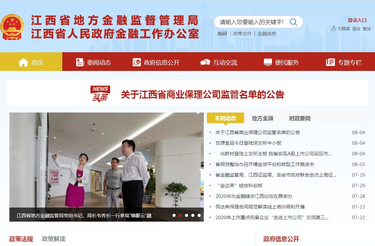 江西省地方金融监督管理局(江西省政府金融工作办公室)是省政府直属机构,为正厅级。江西省地方金融监督管理局贯彻落实党中央关于金融工作的方针政策和决策部署,在履行职责过程中坚持和加强党对金融工作的集中统一领导。其主要职责是:(一)组织起草与履职有关的地方金融法规、规章草案,加强地方金融立法,实施依法行政。会同有关部门拟定地方金融业发展规划、政策措施,并组织实施。(二)负责联系、协调中央金融管理部门派出机构与驻赣金融机构,引导银行信贷服务实体经济,促进多层次资本市场健康发展,引导保险业服务地方经济社会发展。(三)配合中央金融管理部门派出机构开展金融监管。受省政府委托,负责对市、县(市、区)政府金融工作进行业务指导、考核评估和提出风险问责的建议等工作。(四)负责对全省小额贷款公司、融资担保公司、区域性股权市场、典当行、融资租赁公司、商业保理公司、地方资产管理公司实施监管;强化对全省投资公司、开展信用互助的农民专业合作社、社会众筹机构、地方各类交易场所的监管。负责地方金融业统计工作。(五)牵头组织开展全省防范和处置非法集资、互联网金融风险专项整治,配合查处、打击非法金融机构和非法金融业务活动。牵头地方金融信用体系建设。建立健全地方金融风险监测防范与处置机制,牵头维护全省金融稳定。(六)组织推进地方金融改革创新。协调推进地方法人金融机构的发起设立和规范发展,协助支持全省农村合作金融机构改革发展。组织推进金融科技创新。开展金融对外合作交流,统筹协调与金融机构的合作。(七)领导和指导与行政机关脱钩后全省性金融行业协会商会的党的建设工作。会同有关部门指导和支持地方金融行业协会规范发展。负责地方国有金融机构监事会的日常管理工作,制订地方金融业从业人员行为管理规范。(八)统筹推进全省金融人才队伍规划与建设工作,指导省内相关用人单位的金融人才引进、培育和使用等工作。负责对地方国资控股金融机构的高管任职进行资格性审查,配合有关部门对其他地方法人金融机构的高管任职进行资格性审查。(九)完成省委、省政府交办的其他任务。(十)职能转变。紧紧围绕服务实体经济、防控金融风险、深化金融改革任务,提高金融资源配置效率,强化地方金融监管,消除监管盲区和监管空白,提高防范处置金融风险能力,维护地方金融稳定,深化地方金融改革,做大做强做优金融业。