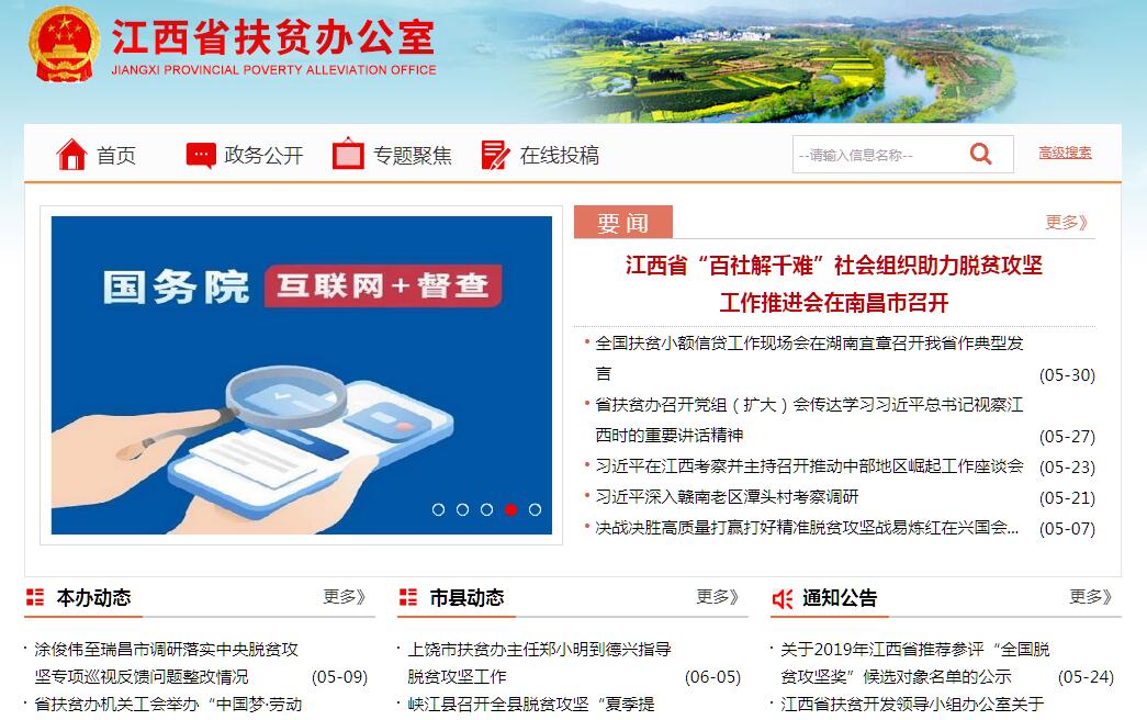 根据《江西省人民政府办公厅关于印发江西省扶贫和移民办公室主要职责内设机构和人员编制规定的通知》(赣府厅发〔2009〕33号)和《省委办公厅 省政府办公厅关于省扶贫和移民办公室更名的通知》(赣厅字〔2018〕100号)精神,江西省扶贫办公室主要职责是:一是贯彻执行党和国家及省委、省政府有关扶贫开发、老区建设和移民工作的方针、政策;拟订全省扶贫开发、老区建设和移民工作的政策法规并组织实施;负责全省扶贫开发、老区建设和移民统计监测工作。二是在全省经济社会发展总体规划的框架内,拟订全省老区、贫困地区扶贫开发规划和年度工作计划并组织实施;会同有关部门编制全省移民后期扶持规划和年度项目计划并组织实施;按权限审核全省深山区移民、灾后移民、工程移民和新建大中型水库(水电站)移民等各种移民安置规划。三是负责全省扶贫开发、老区建设和移民项目的管理,会同有关部门对全省扶贫开发、老区建设和移民项目的实施情况进行监督检查。四是参与制定全省扶贫开发、老区建设和移民资金使用管理办法;负责全省扶贫资金分配;按规定会同有关部门管理使用移民资金;指导全省扶贫和移民机构的财务会计工作;会同有关部门对全省扶贫开发、老区建设和移民资金使用情况进行稽查审计和监督、检查。