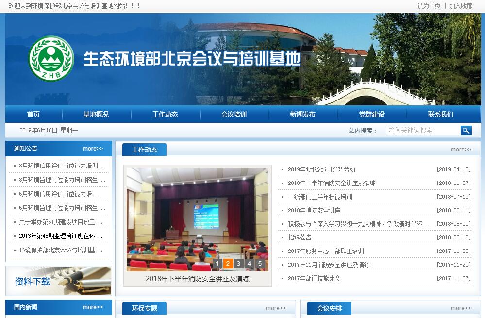 北京会议与培训基地是生态环境部直属事业单位,始建于1989年,其主要职责是为环保系统提供培训与会议服务,历经30多年的建设与发展,迄今已成为环境监察与监测、环境影响评价、环境污染防治及生态保护等培训的重要场所。同时,培训基地为环保系统干部的教育培训和后续人才的储备培养提供了强有力的保障支撑。作为生态环境部的窗口服务单位,培训基地每年还承担着部机关、直属单位一定的会议接待任务,参与部分接待与交流活动。生态环境部北京会议与培训基地地处"上风上水"的优越地段,距颐和园15公里,位于京西鹫峰山脚下,沿京密运河北去,一路青山绿水,满目果园农禾,郁郁葱葱,空气清新环境优美,碧溪垂钓,使人心旷神怡。整体布局为中国传统式庭院式建筑,占地面积近九万平方米院内有千年古松,草坪如茵,绿篱绕径,风光优雅宜人。毗邻大觉寺、阳台山、凤凰岭、普照寺、金山泉、鹫峰山、妙峰山、七王坟、九王坟等名胜古迹,宾客余暇游览将心旷神怡,流连忘返。基地内部基础设施配备完善,有容纳15 至300人的大、中、小会议室13个:设有不同档次的客房145套共280余床位,餐厅可同时容纳250人就餐,其饭菜均由特级名厨料理,质量上乘,富有特色;文体活动中心设有泳馆、保龄球、桑拿、壁球、沙壶球、台球室、棋牌室、KTV、健身房等。