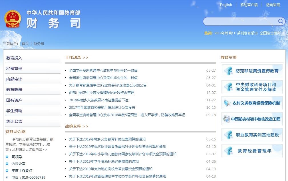 | 网站简介: 教育部财务司的主要职责是:参与拟订教育经费筹措、教育拨款、学生资助的方针、政策;承担统计全国教育经费投入情况的有关工作;负责直属高等学校和直属单位国有资产、预决算、财务管理和内部审计;参与义务教育保障机制经费、有关教育专项经费管理;参与利用国际金融组织等对我国教育贷款的立项工作。 |